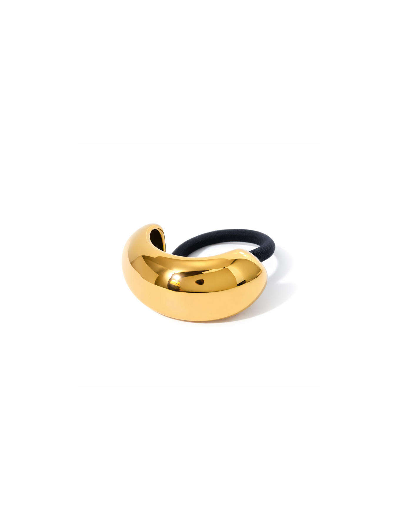 Elegant hårelastik med poleret, guldfarvet metalcover i et blødt, organisk design. Den kombinerer et eksklusivt udtryk med praktisk funktion og er ideel til både hverdag og fest.