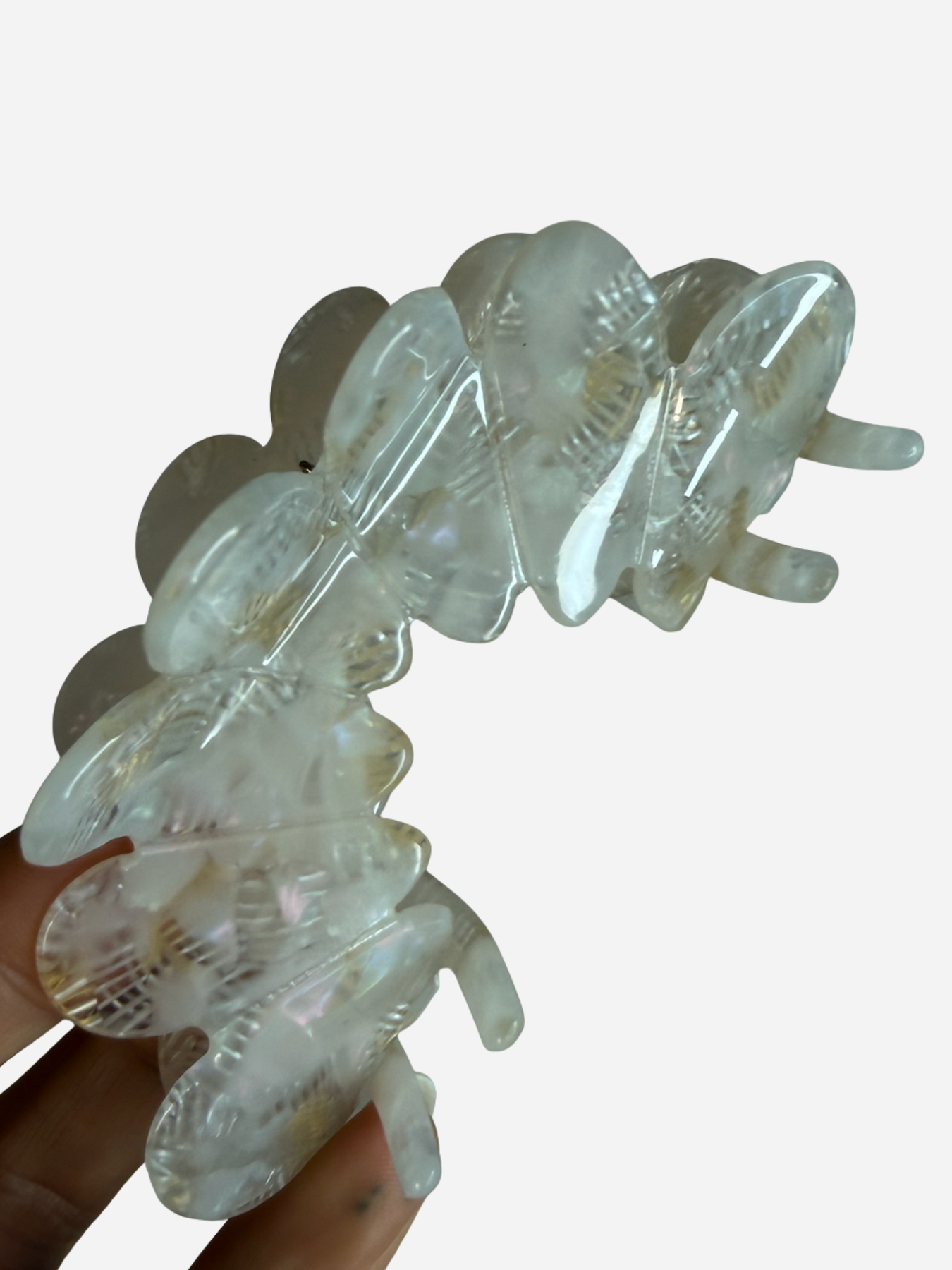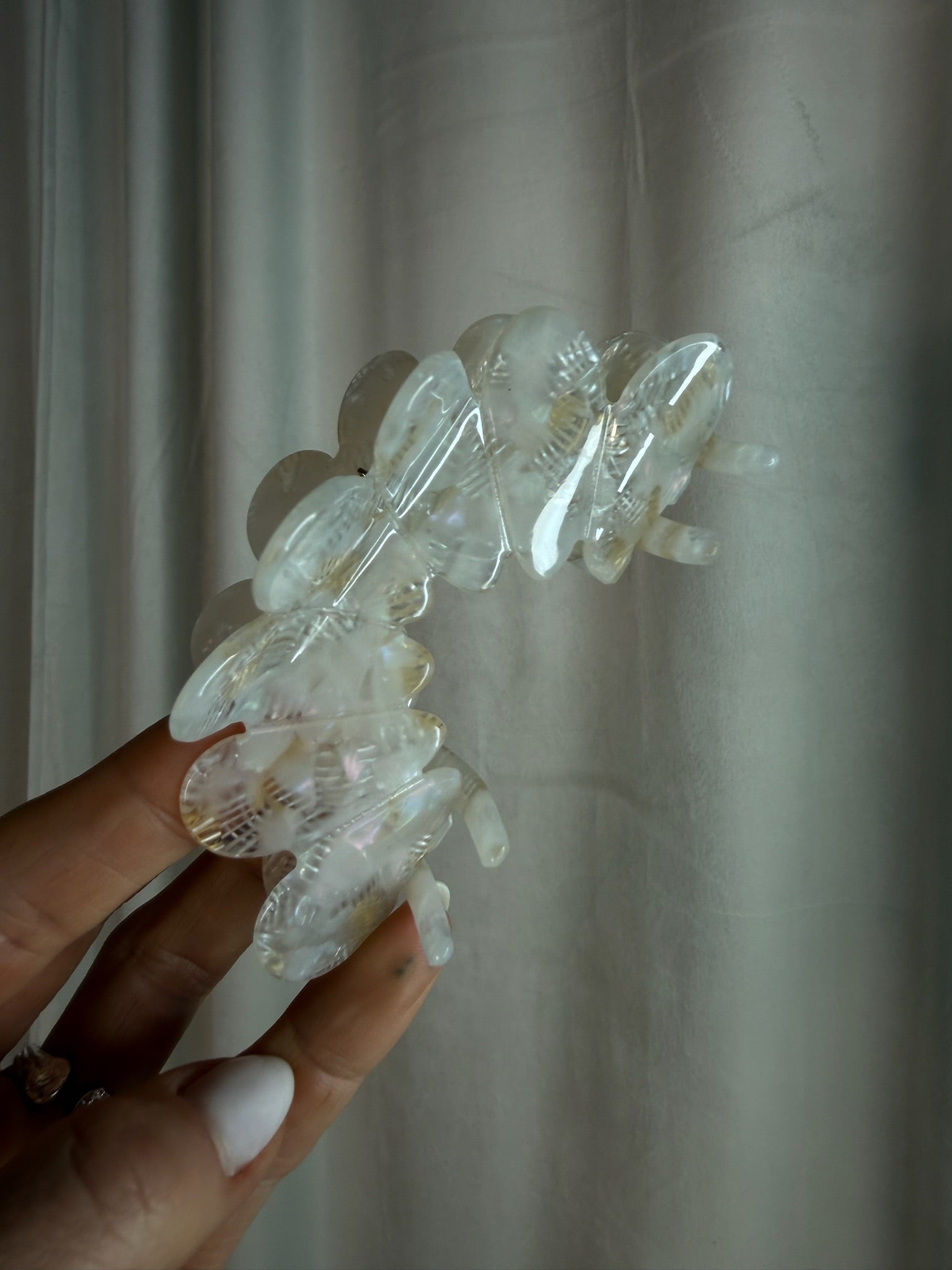 Super fin hårklemme som er fremstillet i et gennemsigtigt materiale med en smuk perlemorsglans og et dekorativt blomsterdesign. De bløde, organiske former kombineret med fine gyldne detaljer giver et elegant og feminint udtryk. Klemmen er både funktionel og stilfuld og egner sig perfekt til at samle håret på en let og sofistikeret måde.