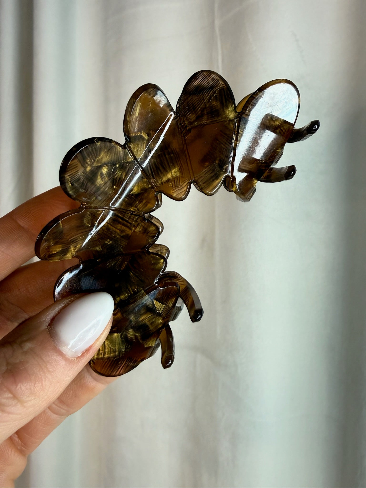 Denne hårklemme er lavet i halvgennemsigtigt resin i en varm, brun nuance med et elegant, organisk udtryk. Den bølgede form giver et dekorativt look, mens den stærke fjeder og de afrundede tænder sikrer et godt og behageligt greb i håret. Perfekt til en enkel opsætning, der både er praktisk og stilfuld i hverdagen.