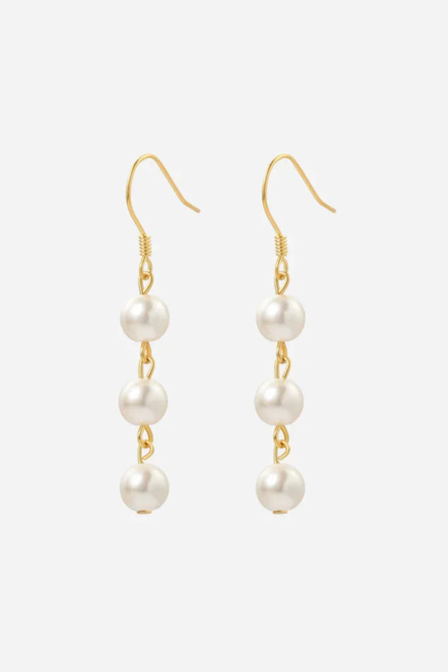 Andcopenhagen Nima øreringe har et vertikalt design med tre naturlige ferskvandsperler på en gylden kæde. De to identiske øreringe skaber en flatterende silhuet, der fremhæver ansigtet.