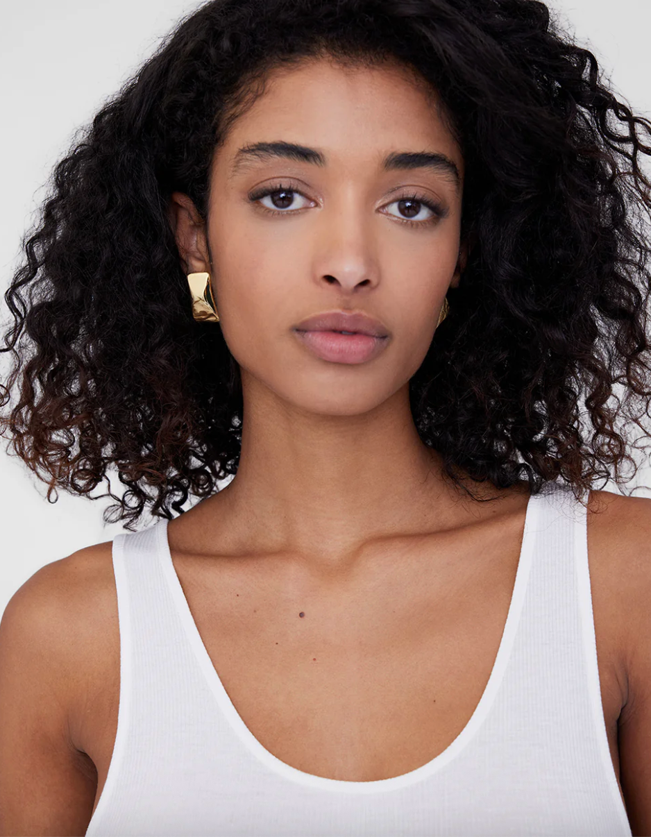 Et rektangulært statement-øreringe designet i messing med 14k guldbelægning, prydet med en spejlvendt buet detalje. Øreringene lukkes med både klassisk clips og sommerfuglelås og har diskret ANINE BING-branding. Sælges som et par.