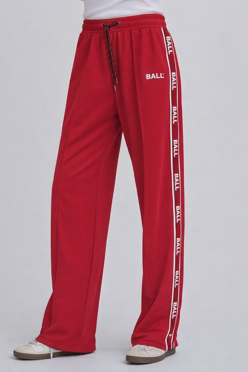 Dertil praktiske sidelommer samt en baglomme med lynlås, og de lange, løse ben fuldendes af kontrastfarvede striber langs siderne og et diskret logo, som tilfører et retro-inspireret touch. Den klare røde farve giver et friskt og iøjnefaldende look, der gør bukserne nemme at style både til afslappede hverdagsoutfits og sporty streetwear.