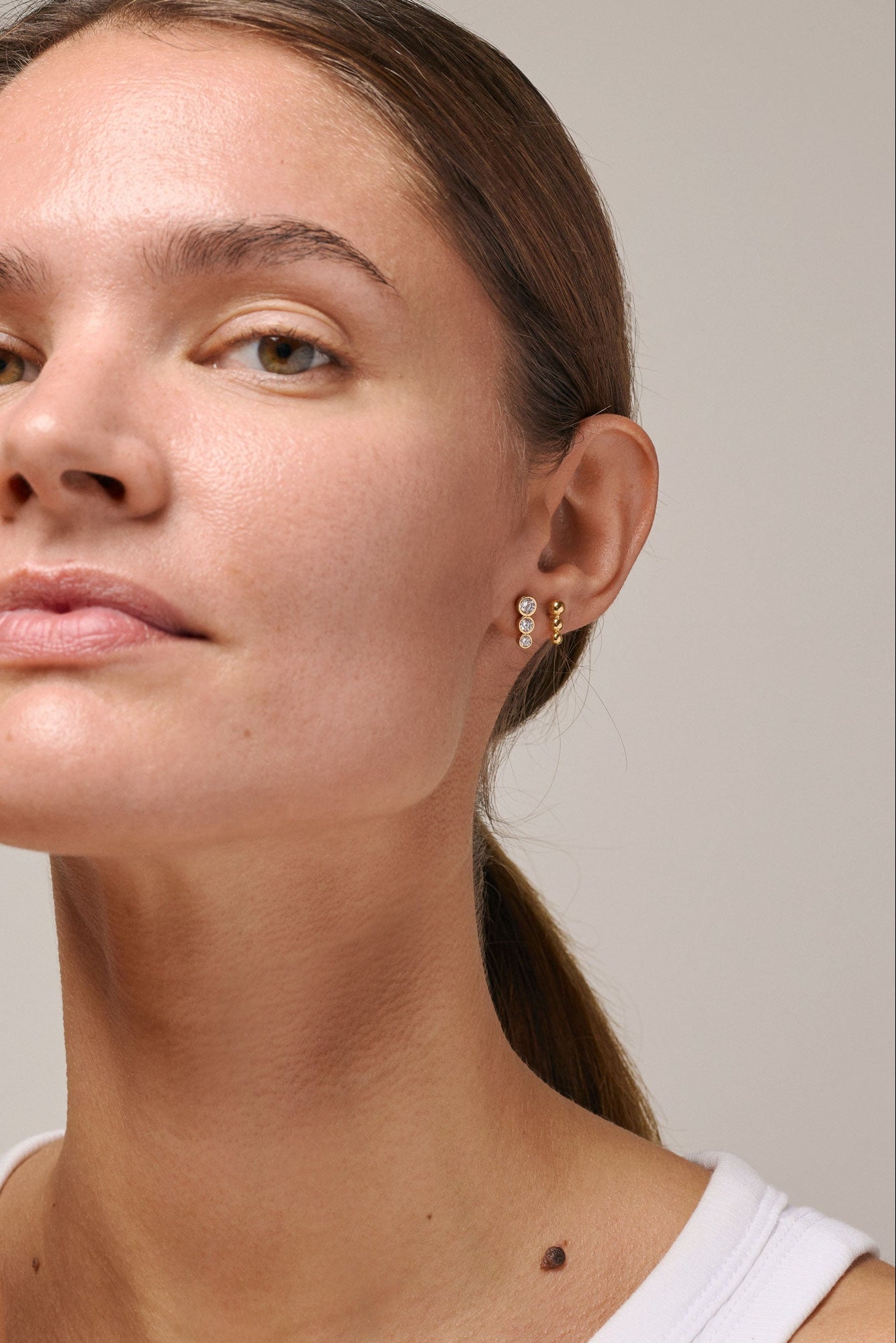 Disse smukke Trinity CZ øreringe i forgyldt sølv forener enkelthed og elegance i ét design. De består af tre klare zirkoner i stigende størrelse, indfattet i blankpolerede rørfatninger, som tilsammen skaber et sofistikeret og moderne udtryk.