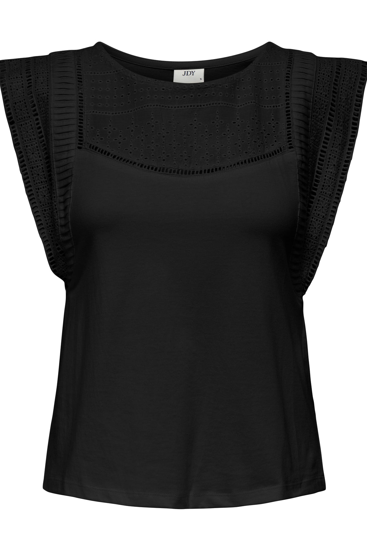 You get a black top with lace details on the front. The round neckline and short sleeves make the top suitable for a shopping trip or other everyday activities.