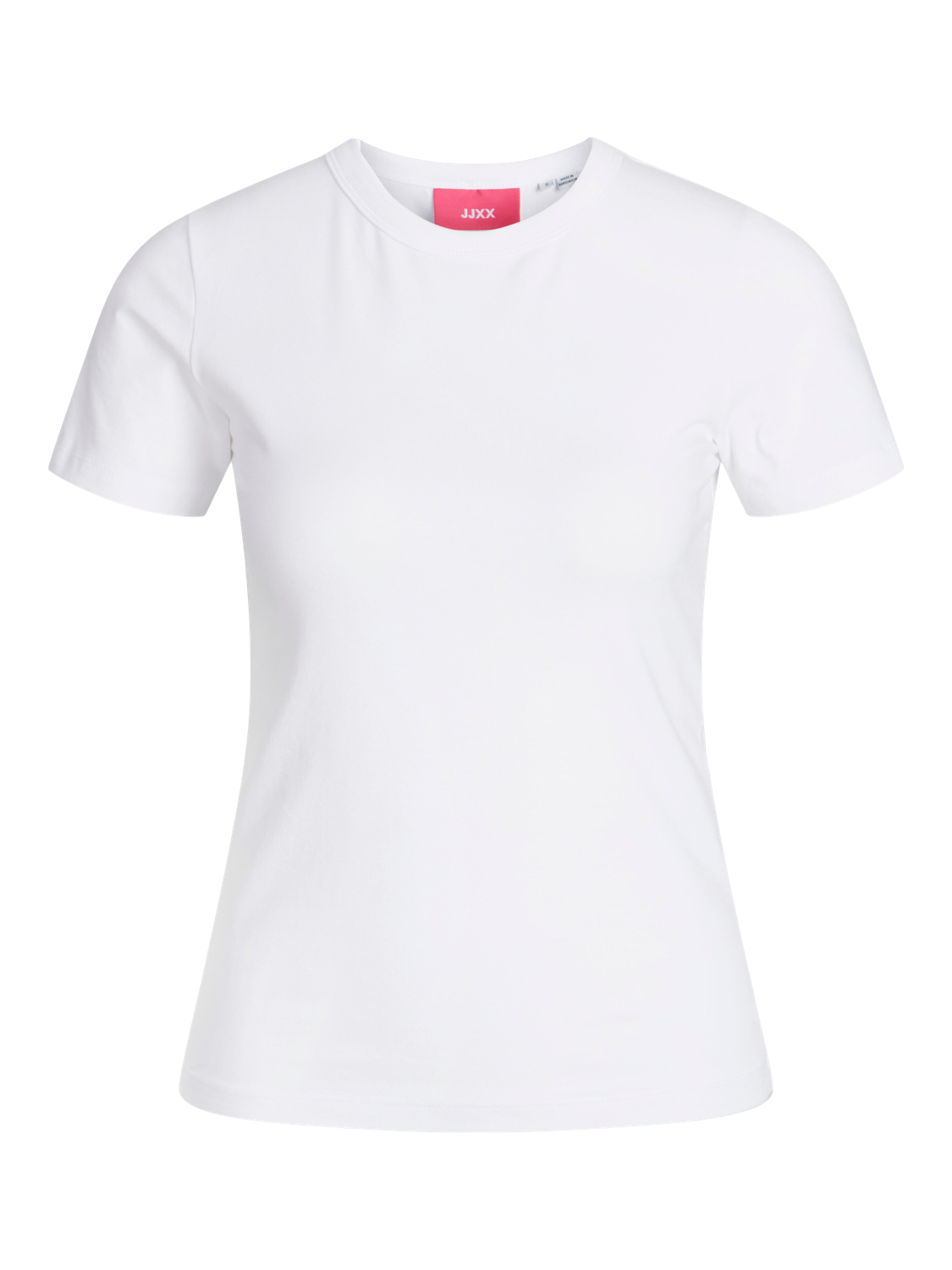 Hvid JJXX T-shirt med korte ærmer og rund hals. JJXX-mærke synligt i nakken.