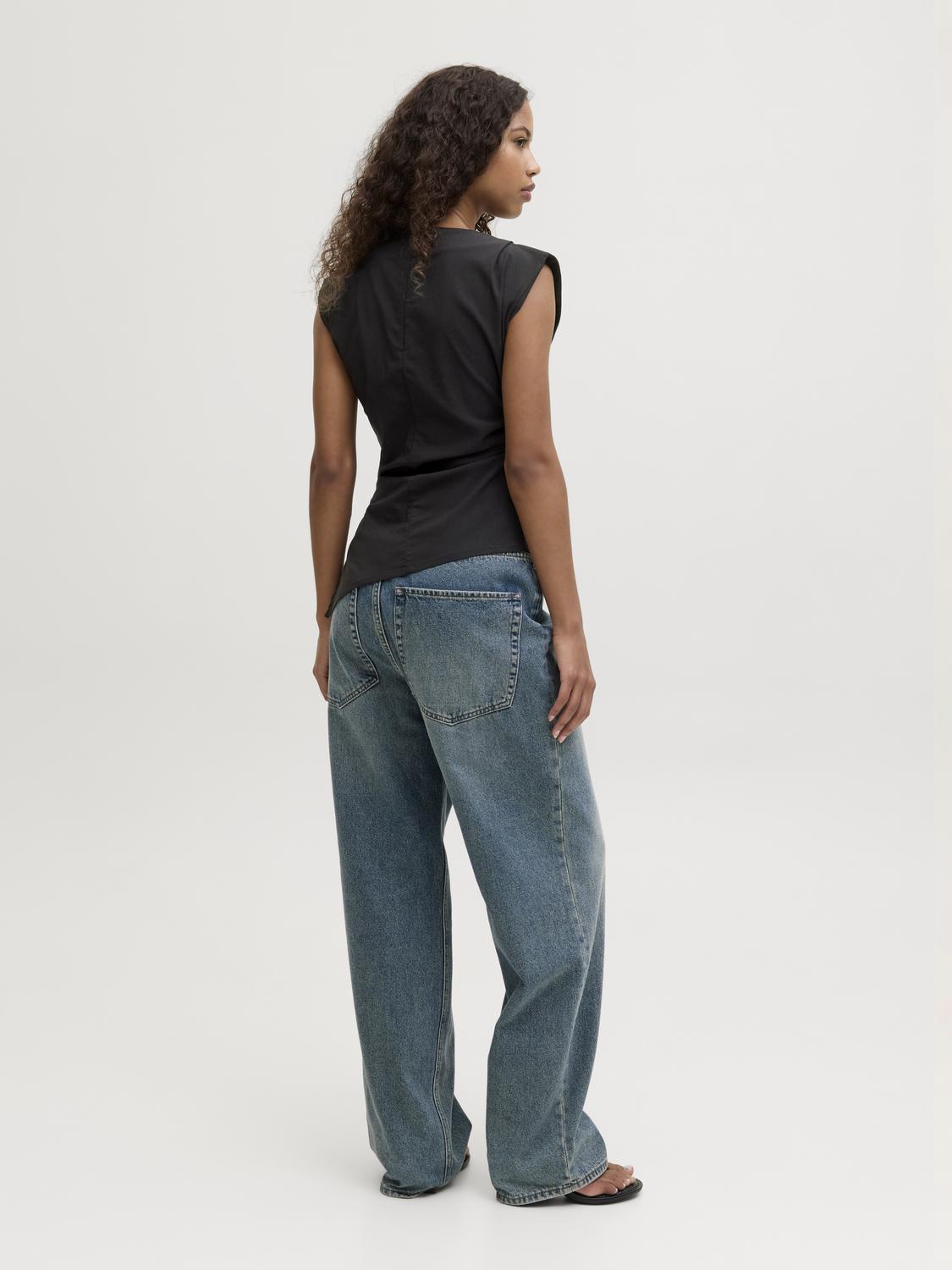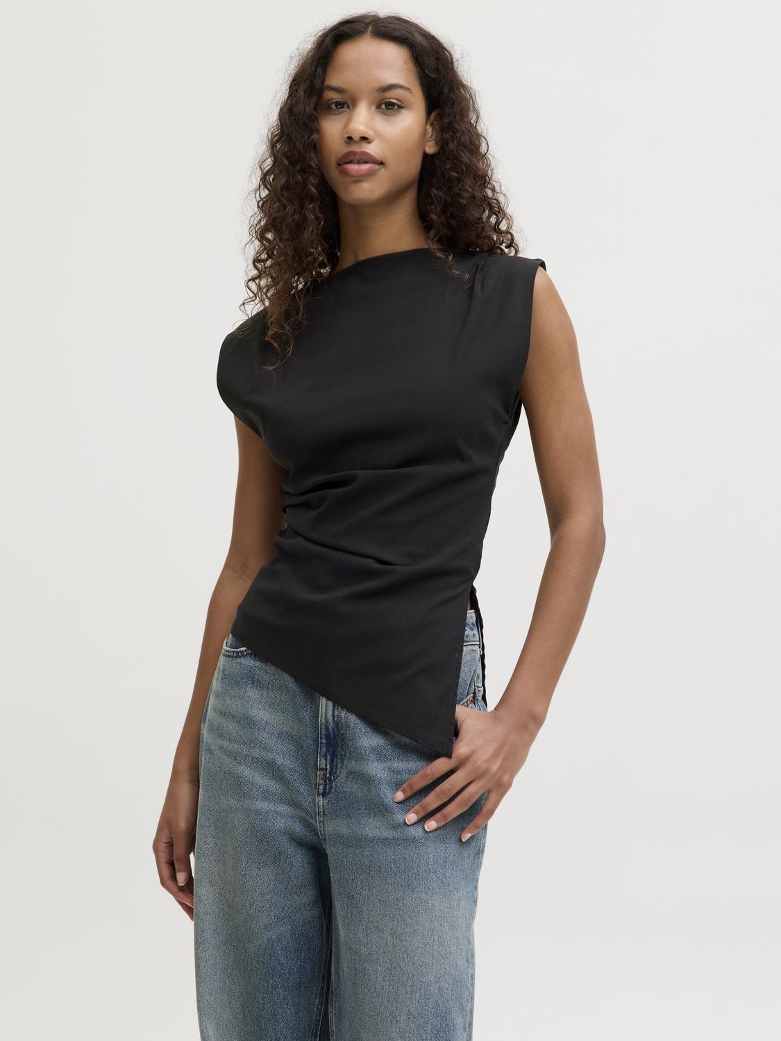 The asymmetrical top has a timeless design with a neckline that goes straight across and the top is sleeveless. The top is fitted and the side slits add a subtle and modern twist to the classic look.