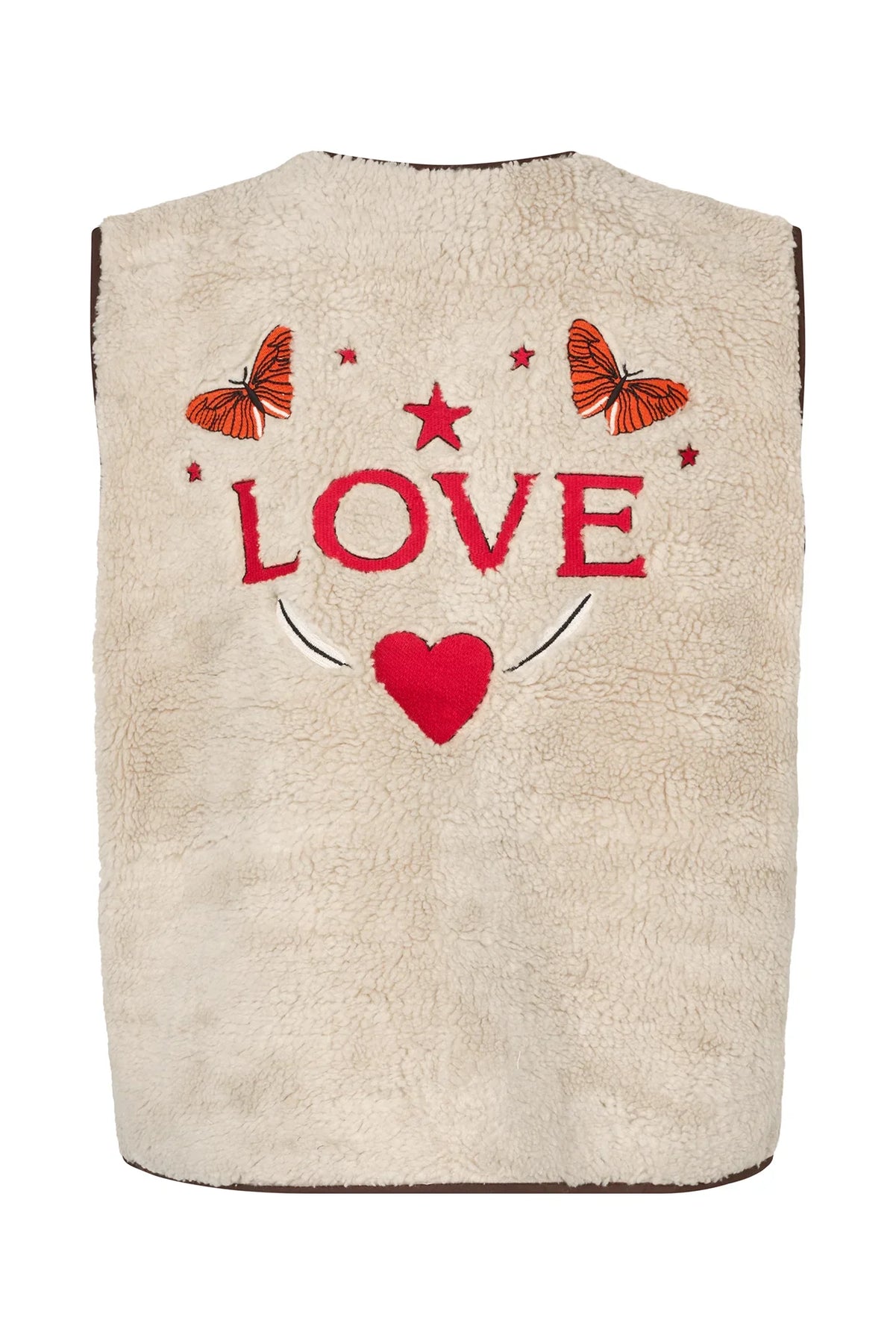 De to frontlommer med klap er udført i en lyserød, stribet kvalitet og tilfører et feminint og charmerende twist. På ryggen fuldendes designet af et smukt statement-broderi med LOVE, hjerte, stjerner og sommerfugle, som giver vesten personlighed og gør hele looket legende og fuld af varme.