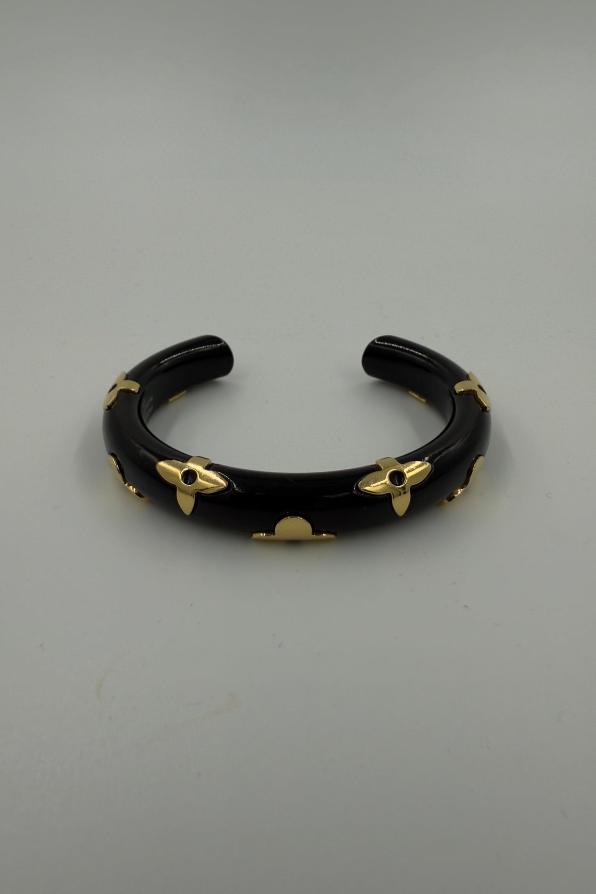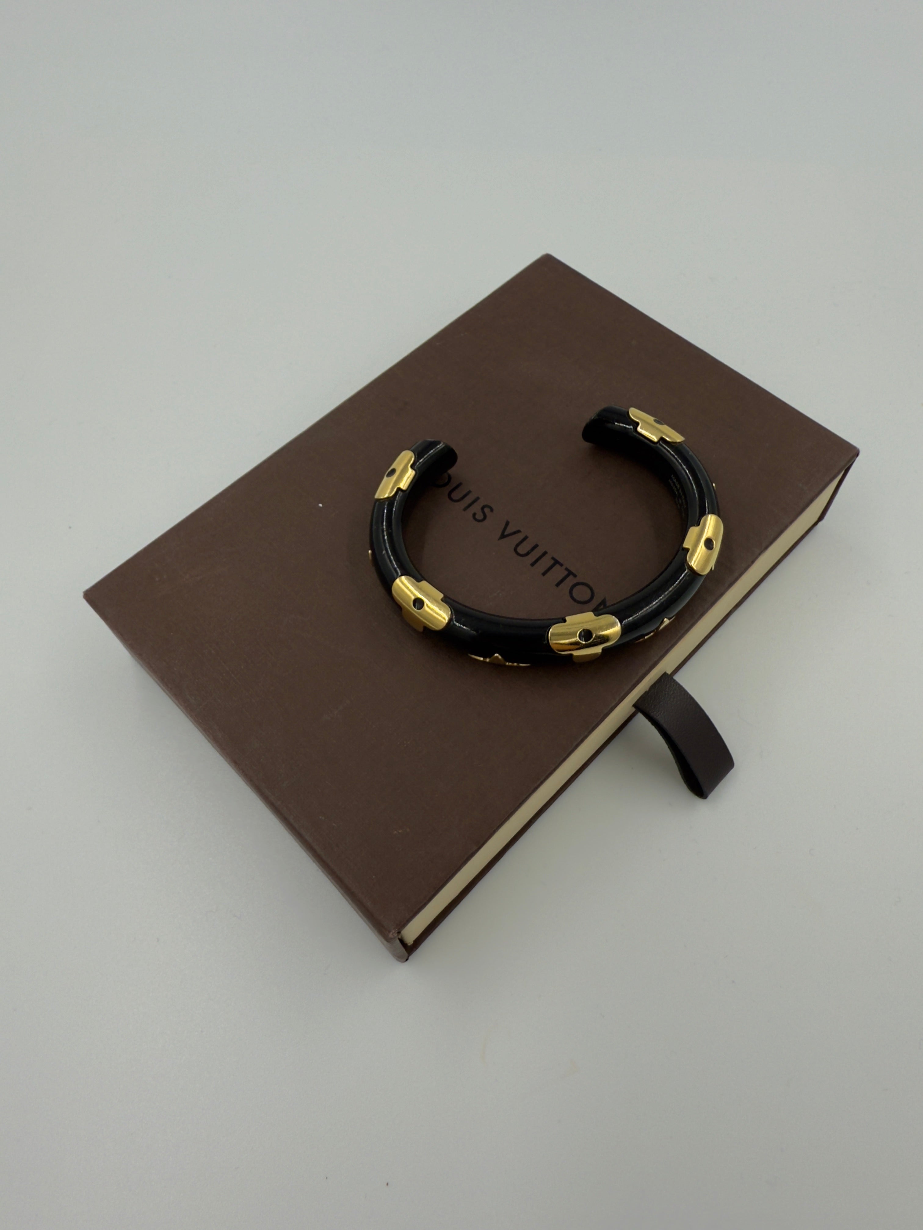 An exclusive Louis Vuitton bracelet in a half-open cuff model, made of black leather with a glossy finish. The bracelet is decorated with several gold-colored metal fittings shaped like the iconic Louis Vuitton Monogram flowers. The fittings are evenly distributed around the entire hoop and give the jewelry an elegant, luxurious and recognizable LV expression.