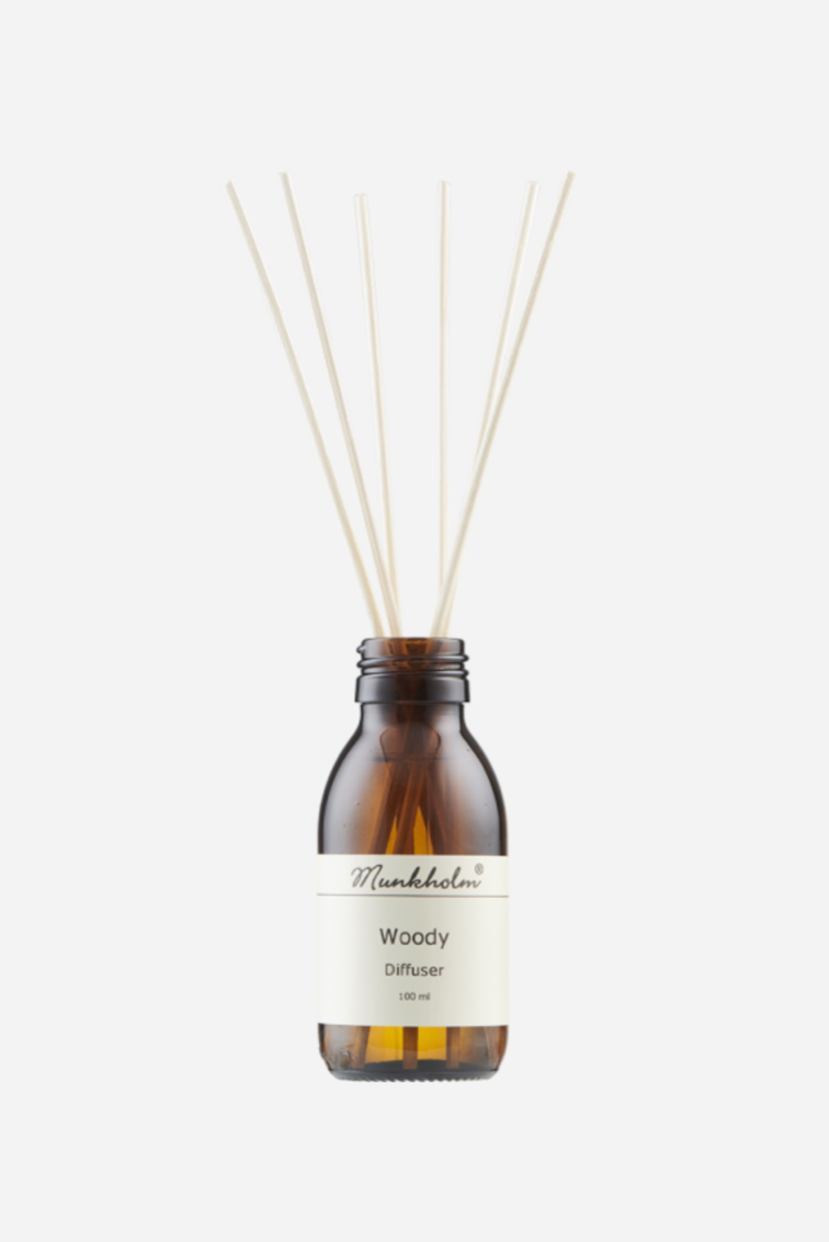 • Brun flaske med Munkholm Woody diffuser, 100 ml, med duftpinde i toppen.