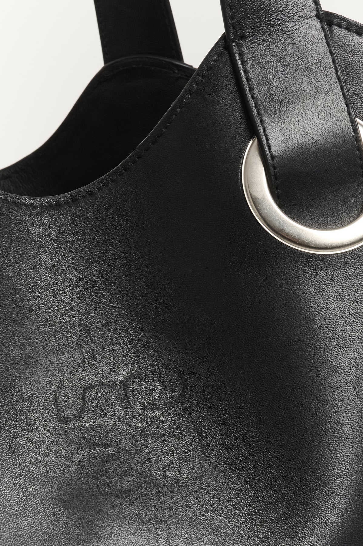 De brede skulderstropper er ført gennem markante, sølvfarvede metalringe, som tilfører et råt og moderne touch til det klassiske design. På fronten ses et diskret præget logo, der understreger det minimalistiske look.