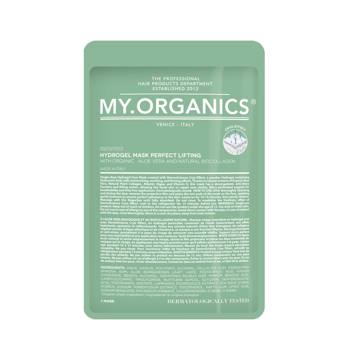 MY.ORGANICS Hydrogel Mask Perfect Lifting er en opstrammende ansigtsmaske med økologisk aloe vera og naturligt biokollagen. Den kølende cryo-effekt hjælper med at fugte, berolige og give huden et mere løftet og friskt udseende. Masken er dermatologisk testet og produceret i Italien.