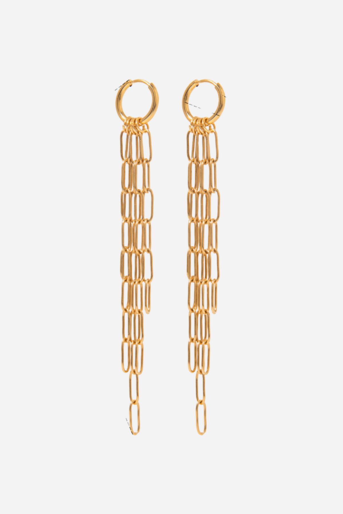 These earrings from NINE combine a round hoop shape with long, movable chain links in a distinctive design. Waterproof earrings that create an eye-catching look for festive occasions. Sold as a pair.