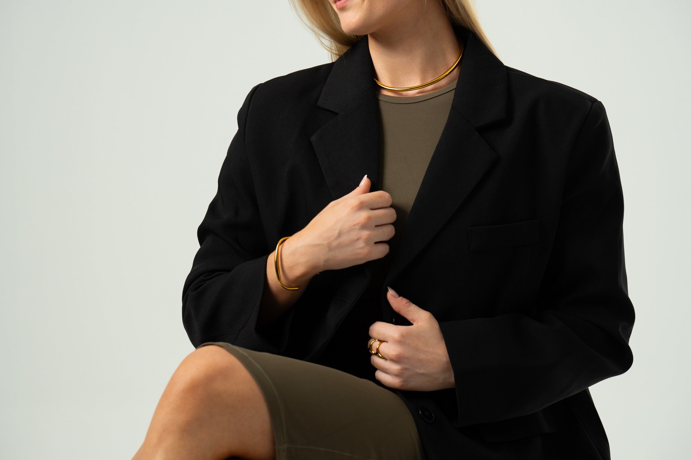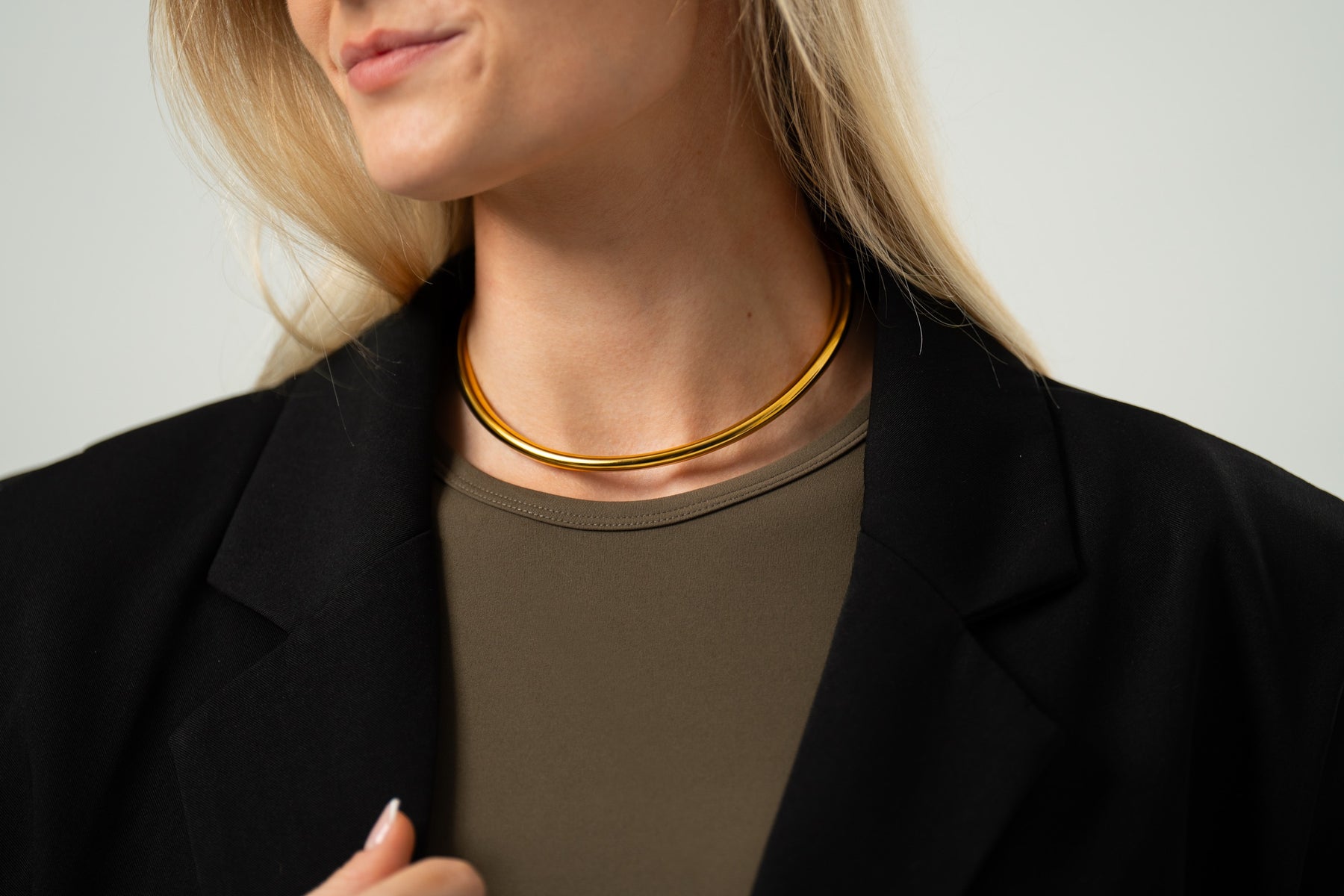 Minimalist stainless steel necklace with a golden finish. The flexible, open shape makes it easy to adjust. The necklace is both water-resistant and 100% nickel-free, so it can be worn everyday.