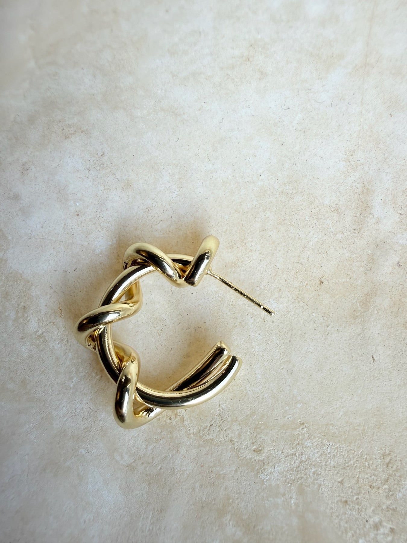 These hypoallergenic earrings are small C-shaped hoops that are inserted like studs, and they have a sculpted, "knotted" look, where several smooth ring elements appear to entwine around each other. The surface is highly polished and gives an exclusive metal look, which suits a minimalist and modern outfit.