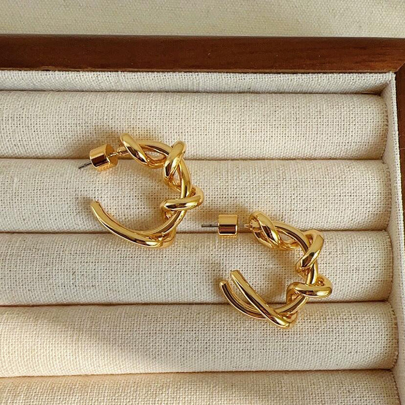 Disse allergivenlige øreringe er små C-formede hoops, der sættes i som en ørestik, og de har et skulpturelt, “knudret” udtryk, hvor flere glatte ringelementer ser ud til at sno sig omkring hinanden. Overfladen er højglanspoleret og giver et eksklusivt metal-look, som passer godt til et minimalistisk og moderne outfit.