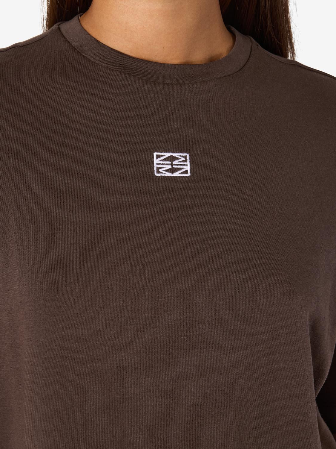 Lightly oversized brown t-shirt from Noisy May. The t-shirt has a round neckline, a longer t-shirt sleeve, and the Noisy May logo on the front. The t-shirt is slightly longer at the back than at the front.