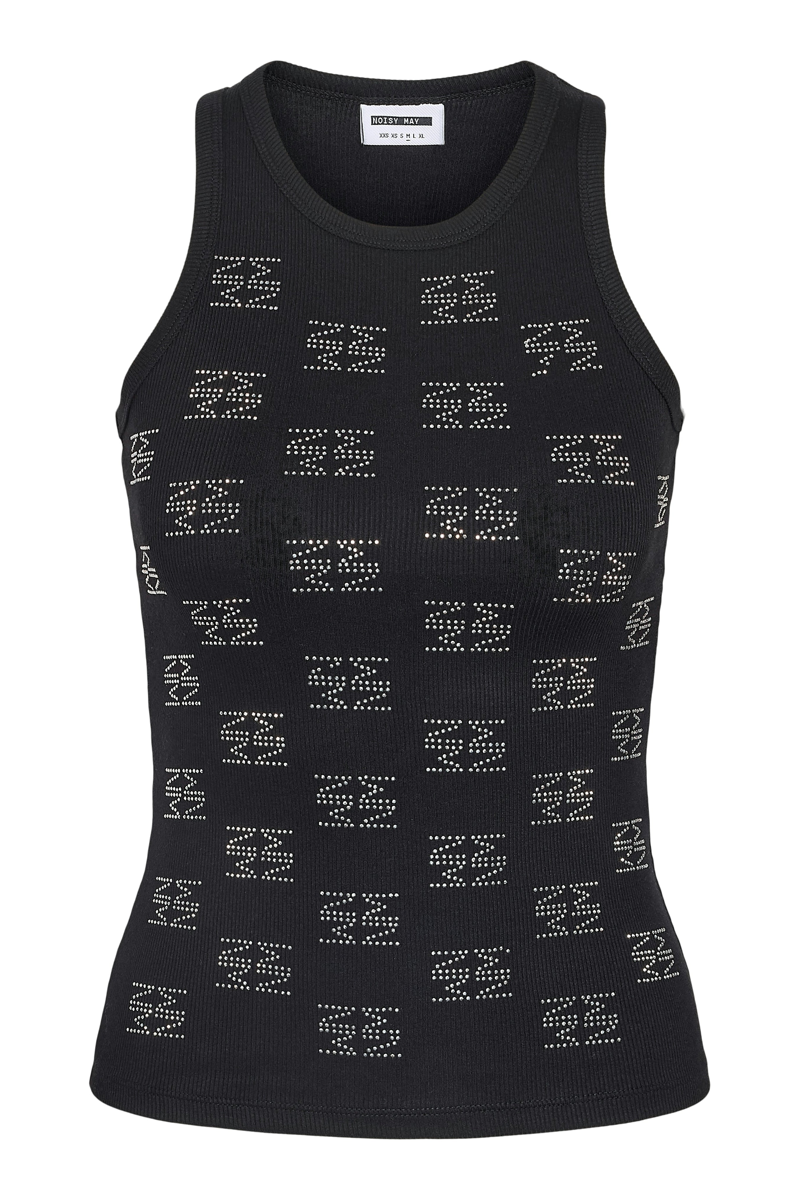 En slank tanktop med rund halsudskæring uden ærmer, der passer perfekt til ethvert outfit. Den sorte top har et elegant touch med rhinestones, som giver et fint detaljeret look. Materialesammensætningen af polyester, viskose og elastan sikrer både komfort og fleksibilitet.