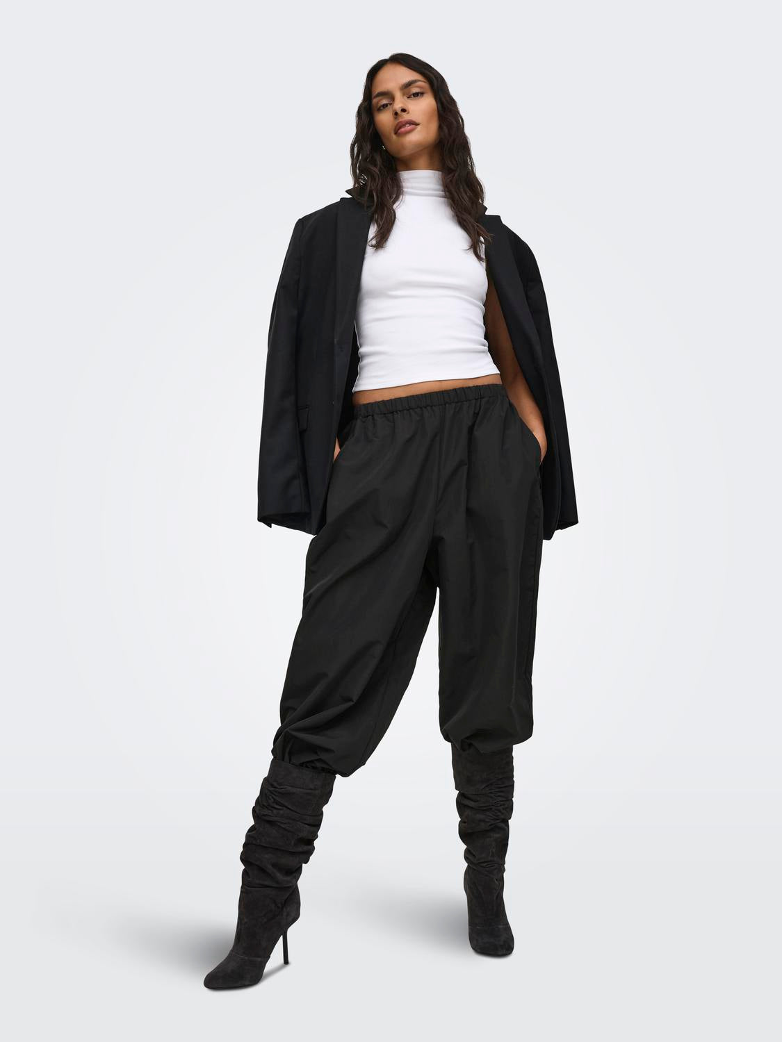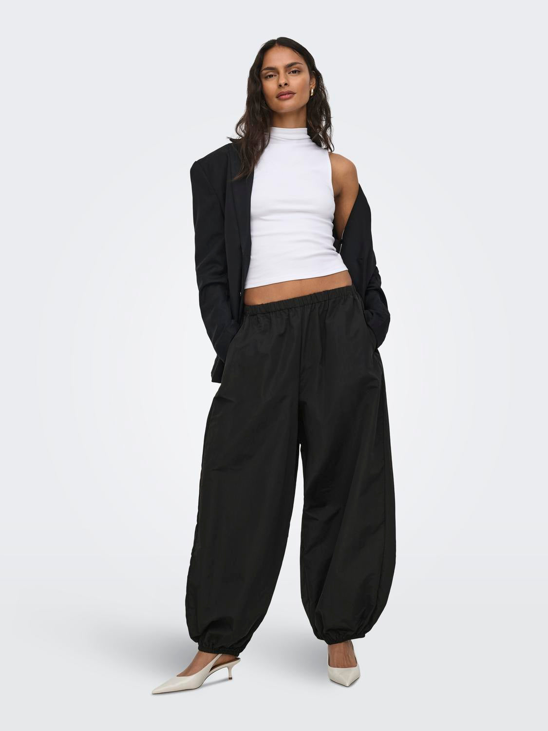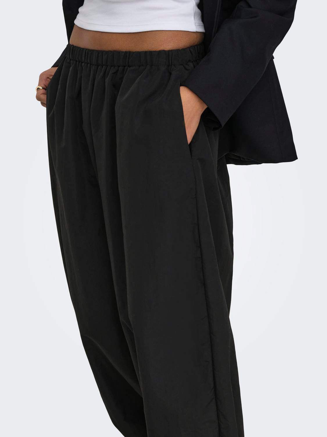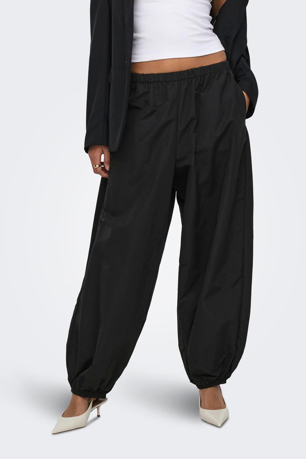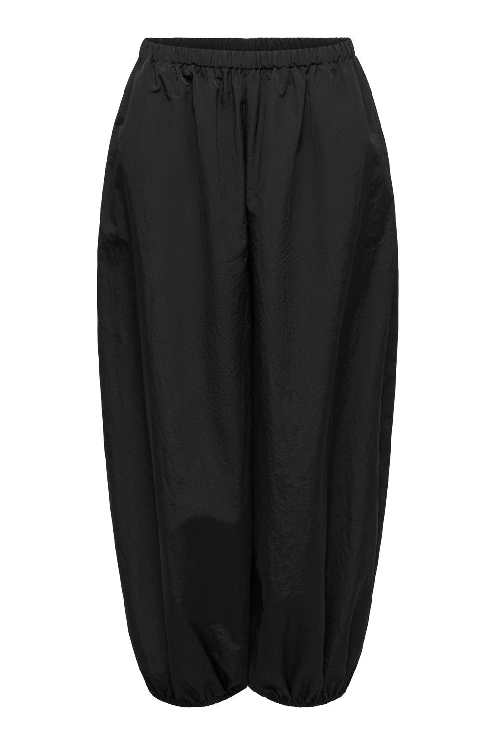 Disse ballonbukser fra Only i sort er designet med en elastisk talje og elastik ved buksebenenes afslutning, hvilket sikrer en behagelig pasform med barrel fit. De har sidelommer, som giver praktisk opbevaringsplads, og er fremstillet i 100% nylon, hvilket gør dem lette og holdbare til hverdagens aktiviteter.