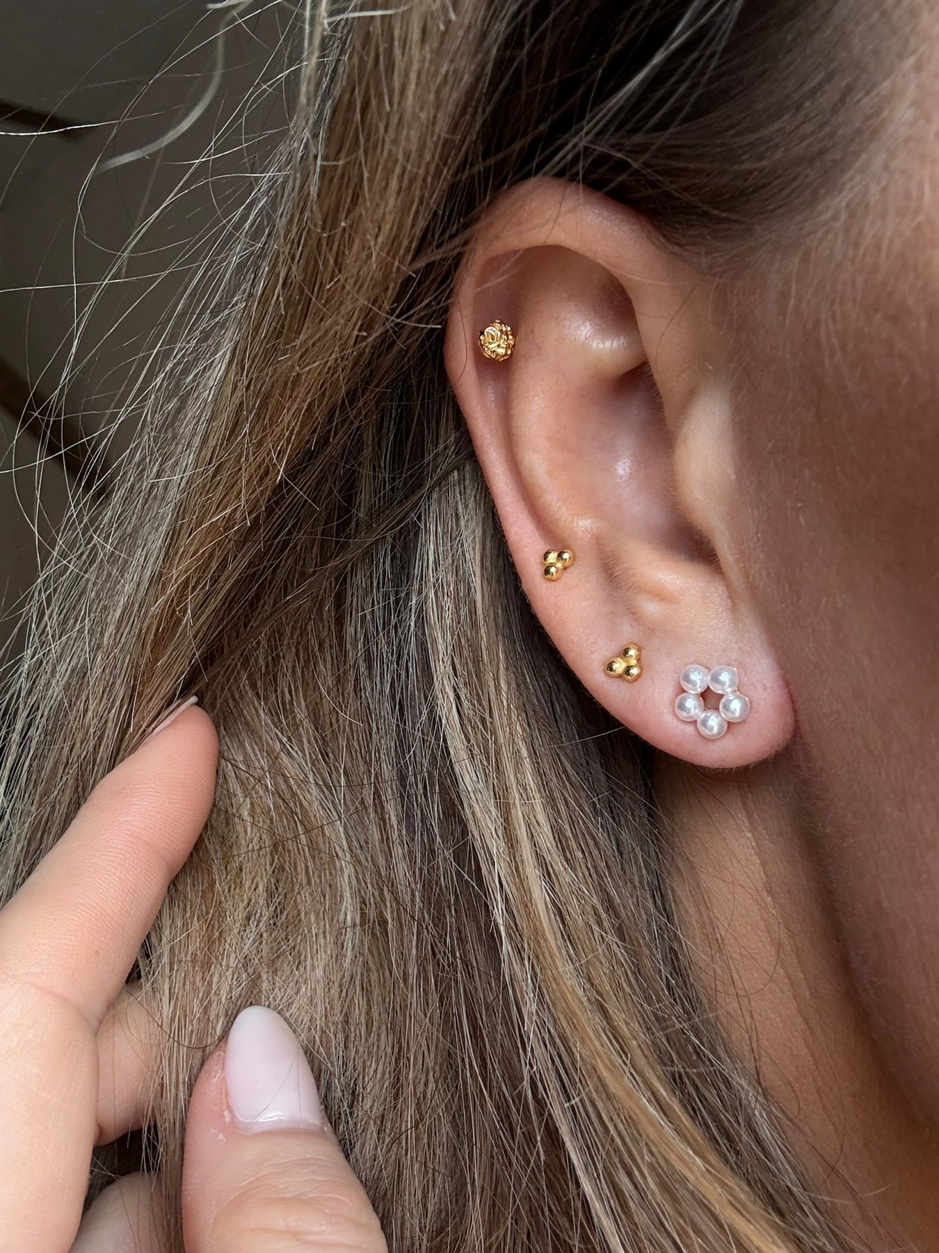These Andcopenhagen stud earrings combine white pearls in a circular formation. Sold as a set, they are suitable for both everyday and festive occasions. Avoid contact with moisture to preserve the finish.