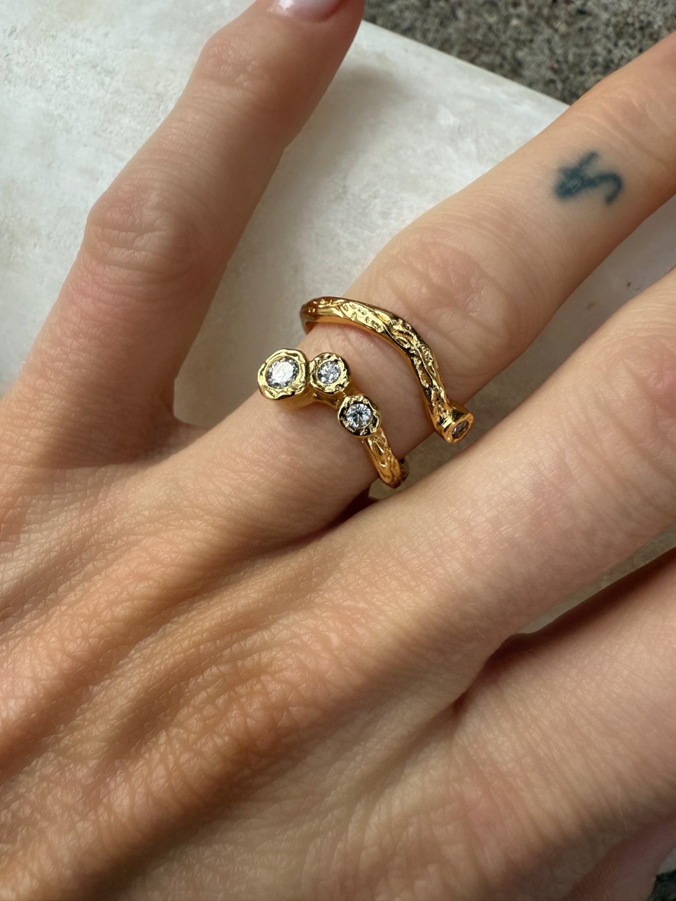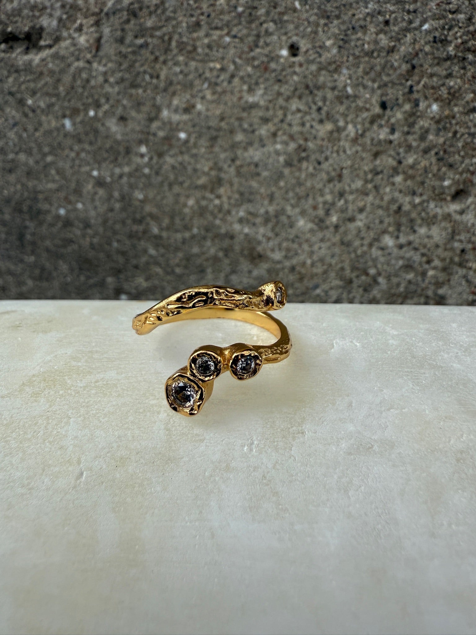 Andcopenhagen introduces the Elvira ring with a distinctive twisted design and four stones in different sizes. The bumped surface creates a vibrant expression, while the adjustable size ensures a good fit.
