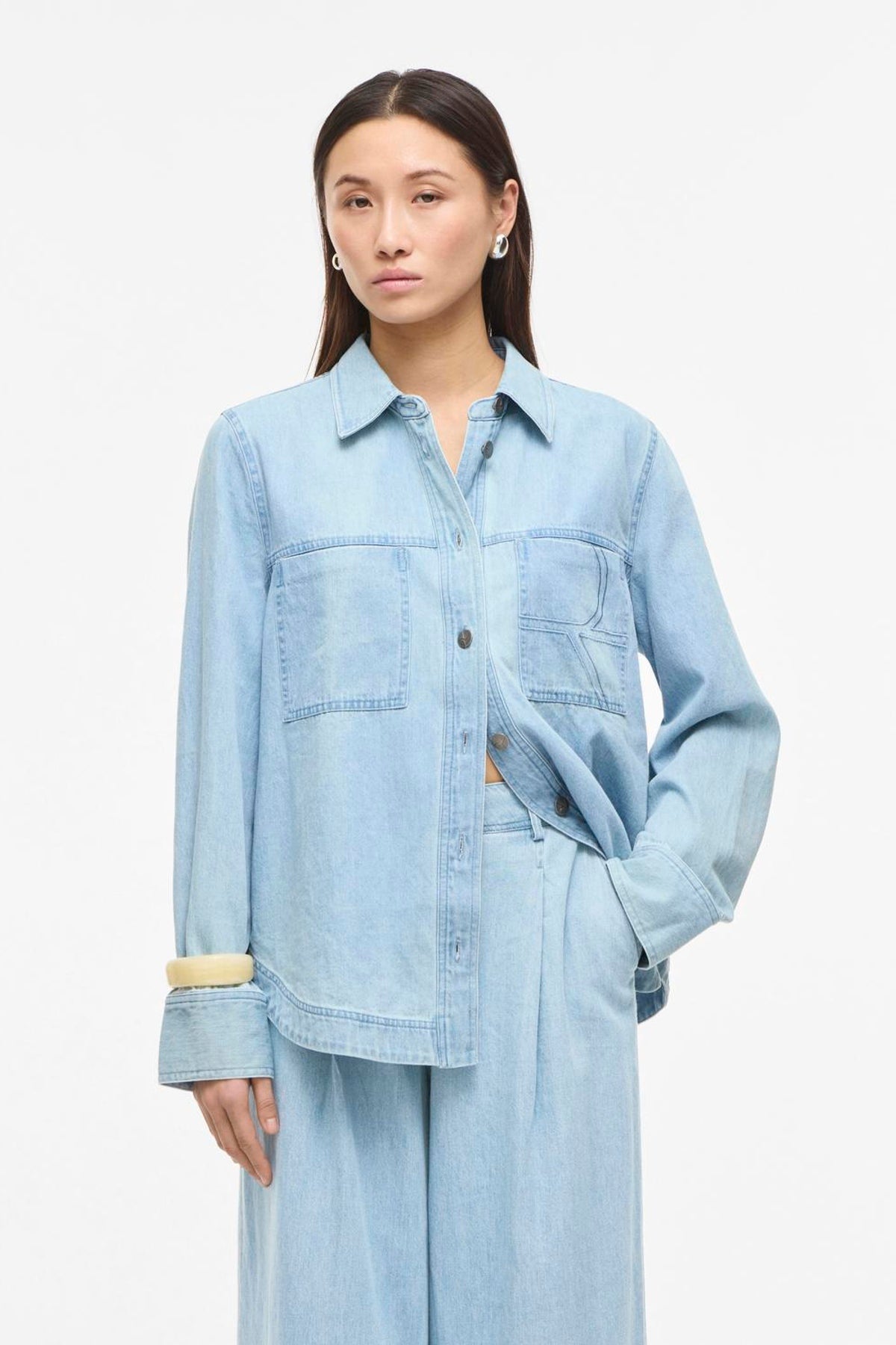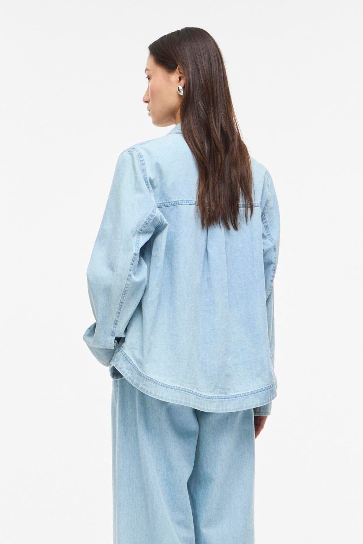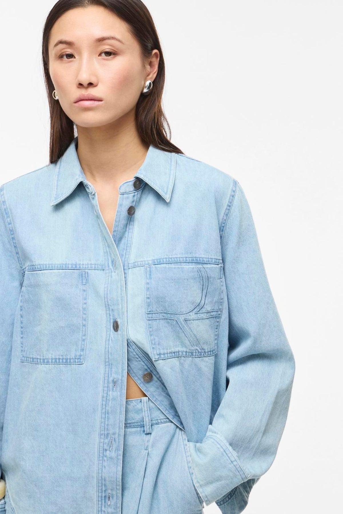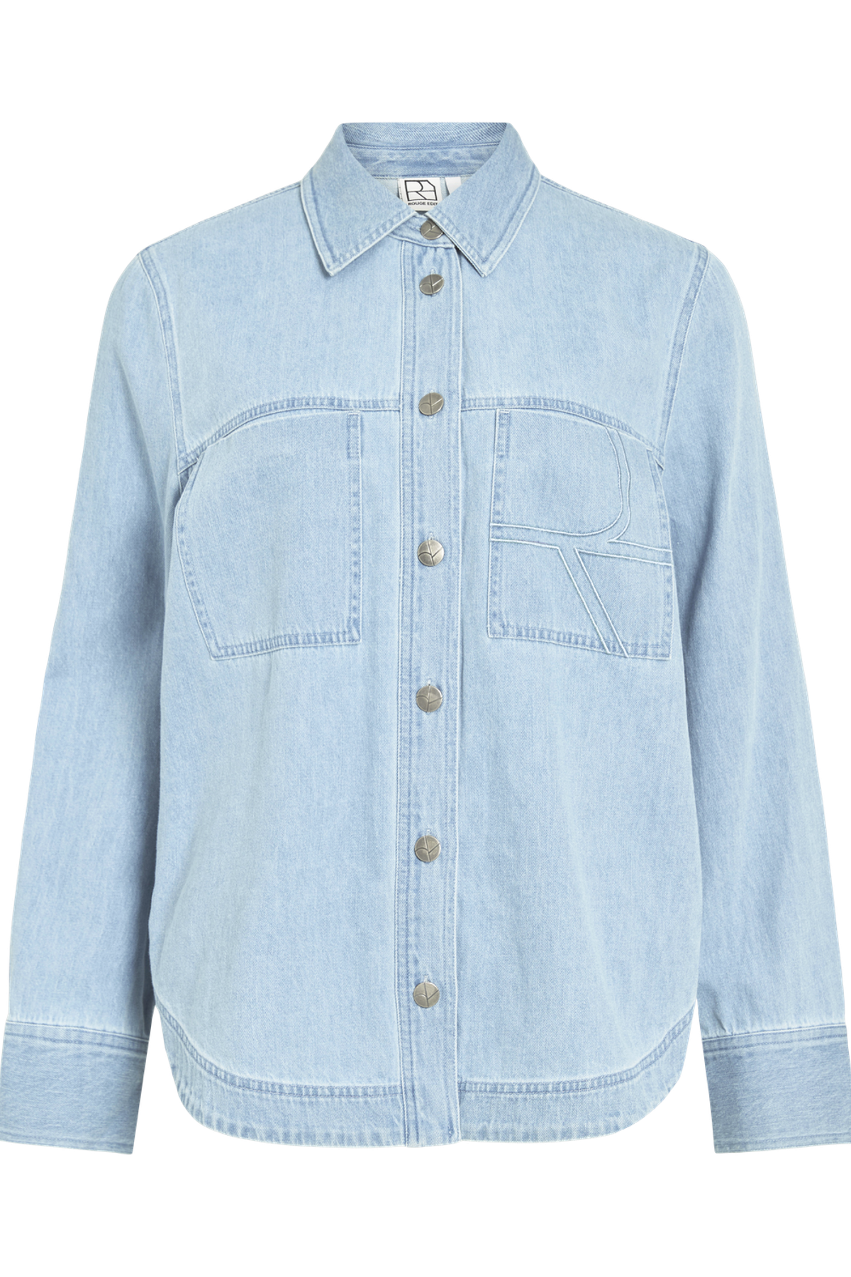 En blød, let oversized skjorte i lys denim, fra Rouge Edit. Udført i 100% bomuld med delikat broderi og klassisk skjortekrave. Den har lange ærmer og brystlommer, og den normale pasform gør den velegnet til både hverdags- og mere formelle looks. Mens broderidetaljen løfter designet med et subtilt, håndlavet præg.