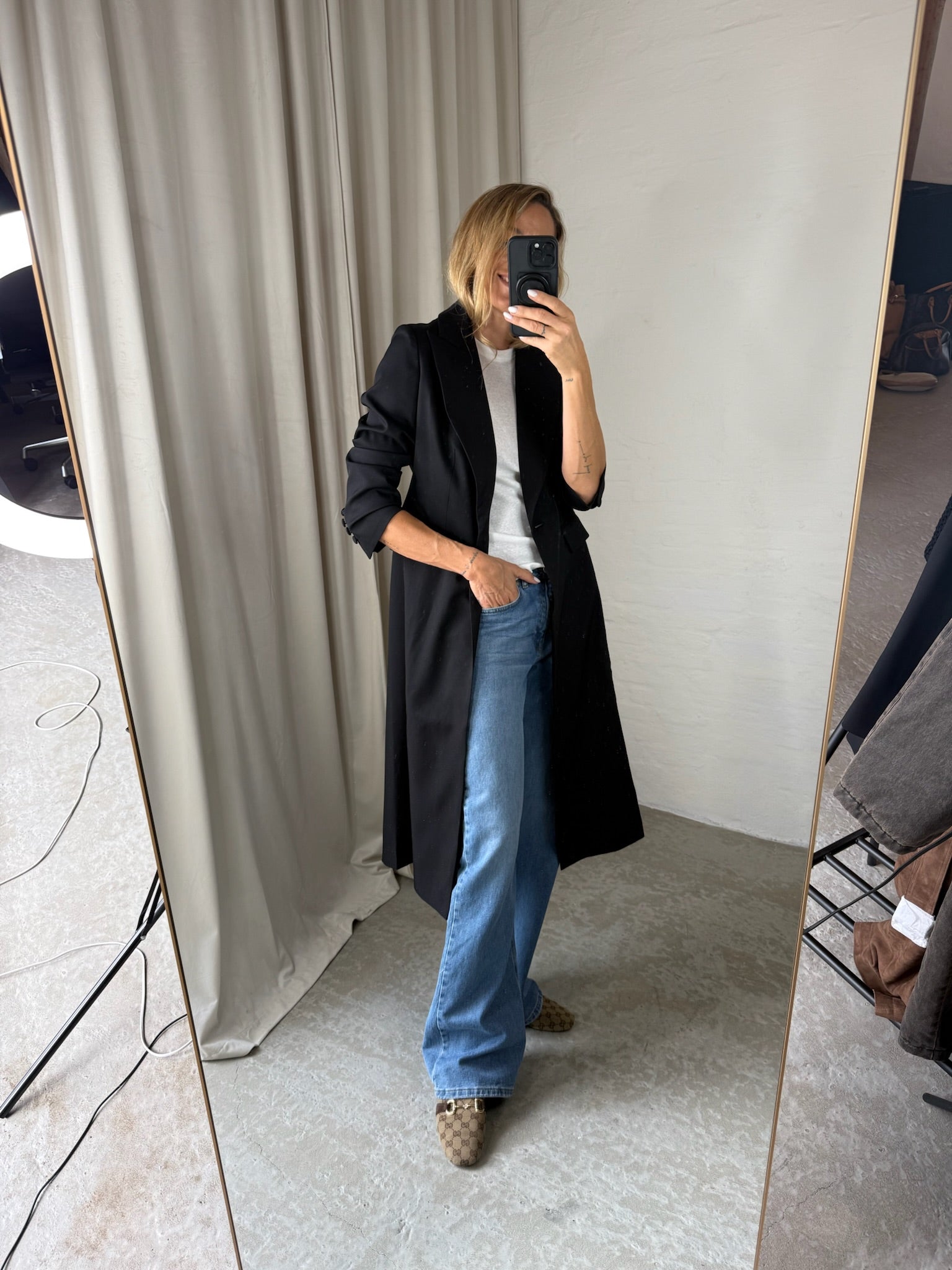 A long black blazer trench coat from Sassy Copenhagen. The jacket has a v-neck and closes with a button at the front. It is also fitted at the waist which gives it a figure and it has two pockets at the front.