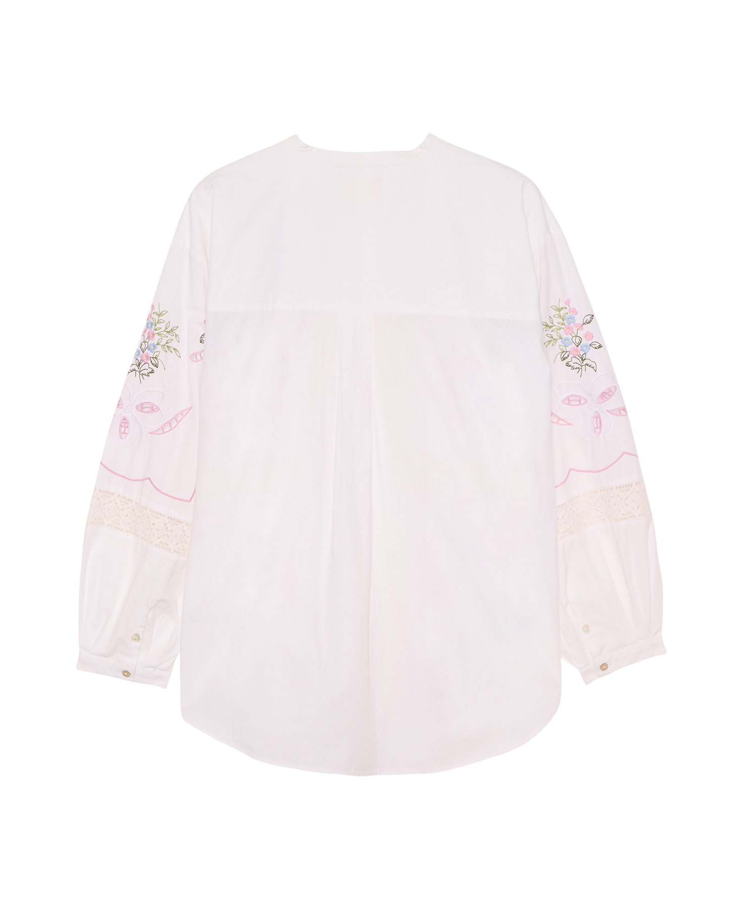 Skjorten har lange ærmer med smalle manchetter og knaplukning samt en rund halsudskæring med en slank standkrave, der lægger sig blødt omkring halsen. Den gennemknappede stolpelukning foran er afsluttet med elegante perlemorsknapper. På ryggen giver et bærestykke med box-pleat midt bag ekstra bevægelsesfrihed og understreger den løse silhuet, mens den buede kant forneden bløder udtrykket op.