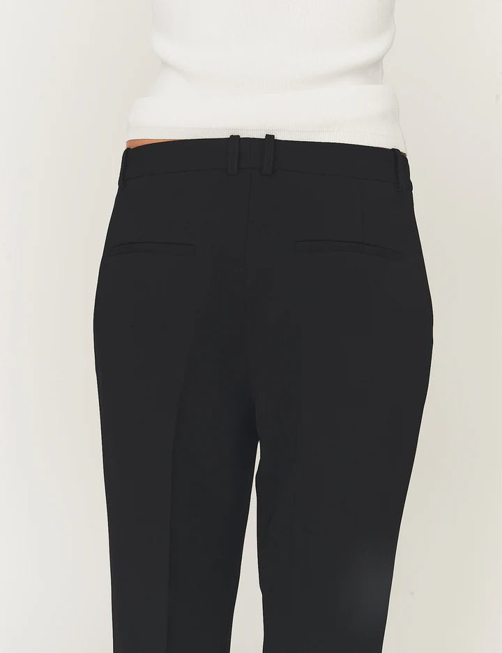 Den eksklusive crepe-kvalitet understreger det sofistikerede look, mens den faste linning med bæltestropper, skrålommer foran og paspolerede baglommer fuldender det skræddersyede design. Perfekte til tailored dressing – både til hverdagsbrug og mere formelle anledninger.
