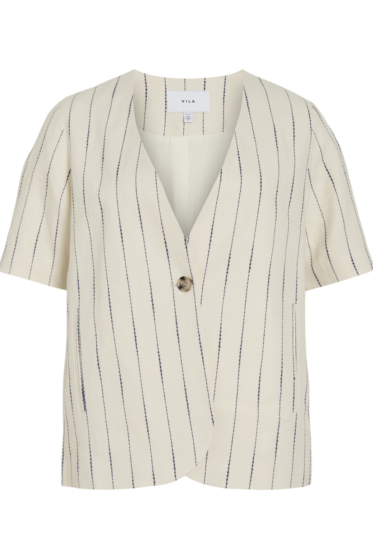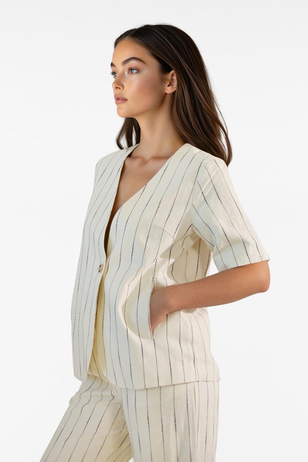 This short-sleeved blazer features a classic and elegant V-neck with button closure, ensuring a timeless and polished look. The regular fit provides comfort and freedom of movement, making it ideal for both everyday wear and more formal occasions. It is made from a light and breathable blend of viscose, linen, and cotton, offering both softness and a natural texture, perfect for the summer season.