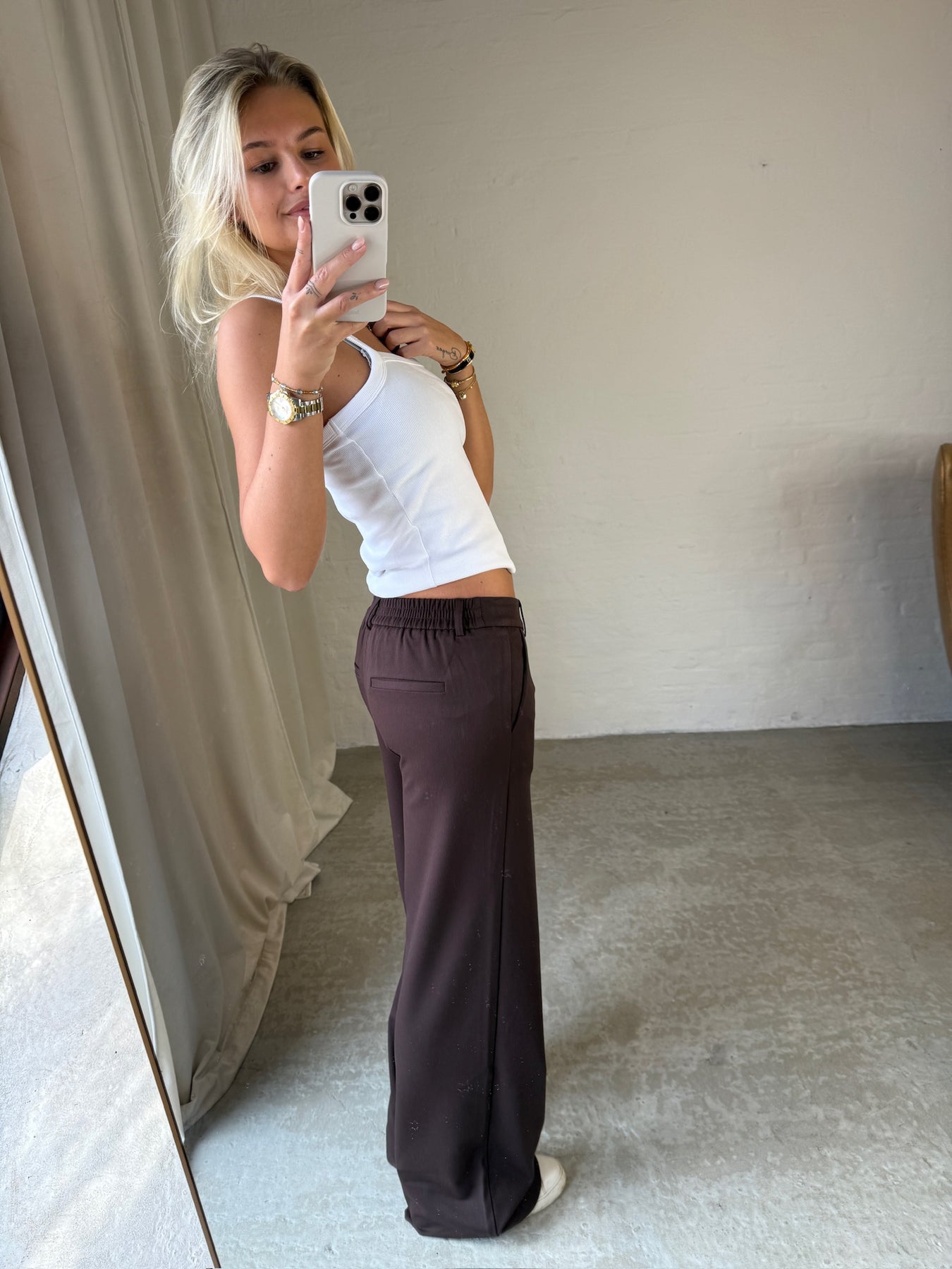 These wide-leg trousers in a deep coffee-brown colour combine comfort with a stylish expression. The trousers have a high waist, which gives a modern and flattering look. The materials consist of recycled polyester, viscose, and elastane, which together ensure both durability and a slight stretch for extra freedom of movement.