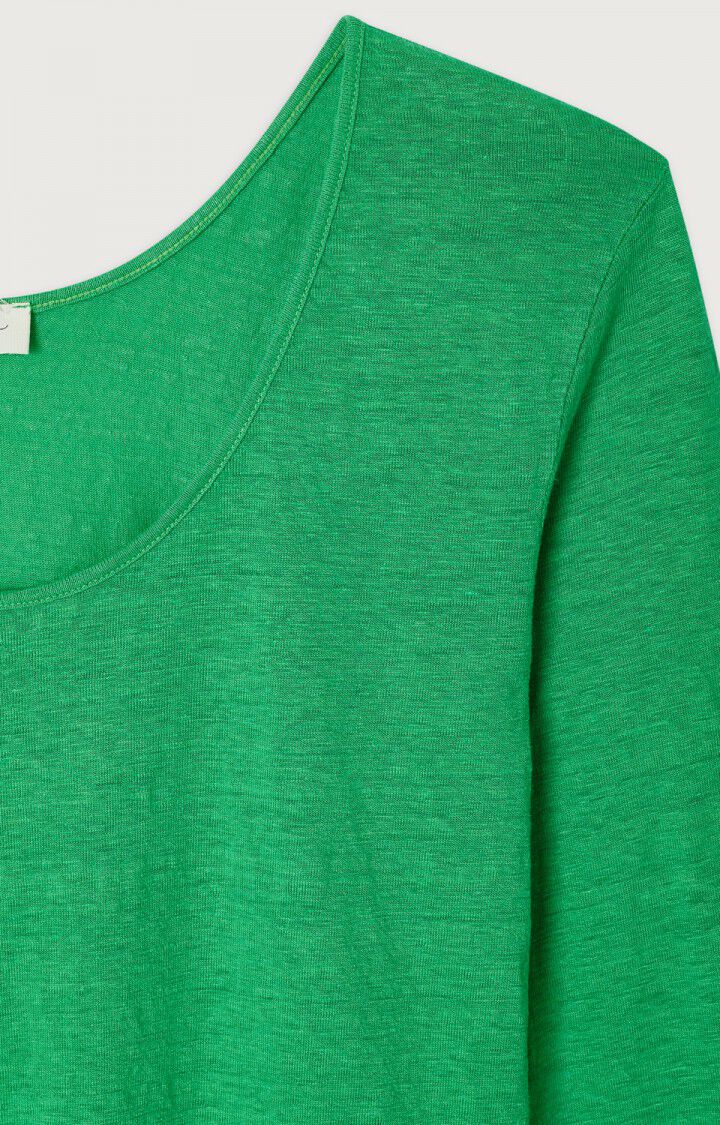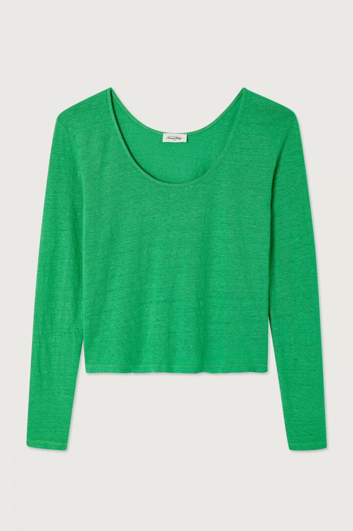 En let og afslappet langærmet bluse i en frisk grøn farve. Modellen har en bred, rund halsudskæring, der giver et feminint og casual udtryk. Stoffet fremstår tyndt og let transparent med en blød, meleret struktur, hvilket gør den ideel til lag-på-lag styling.