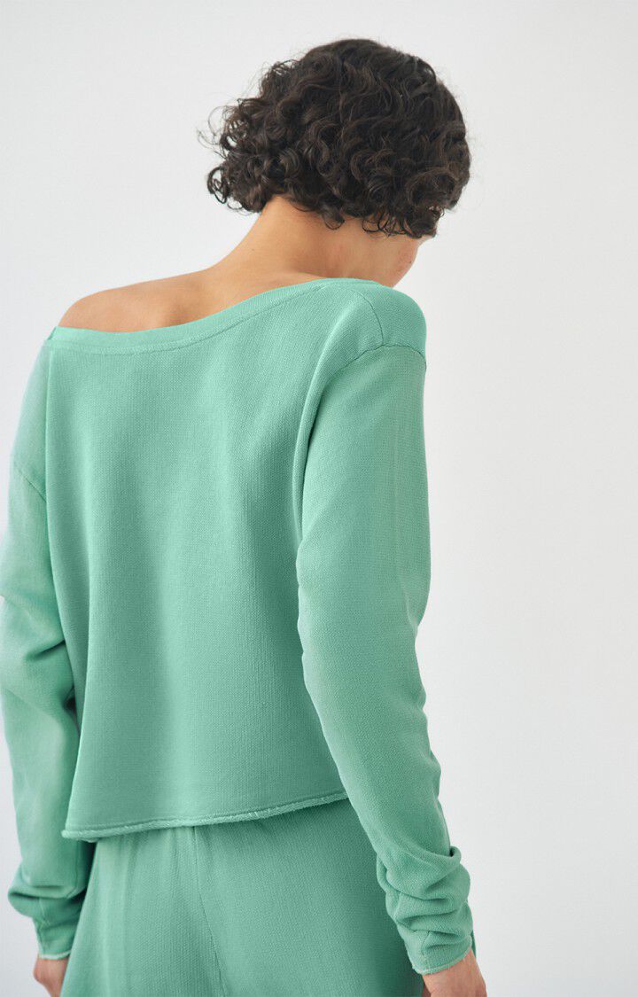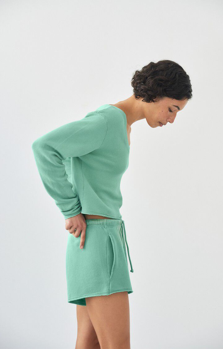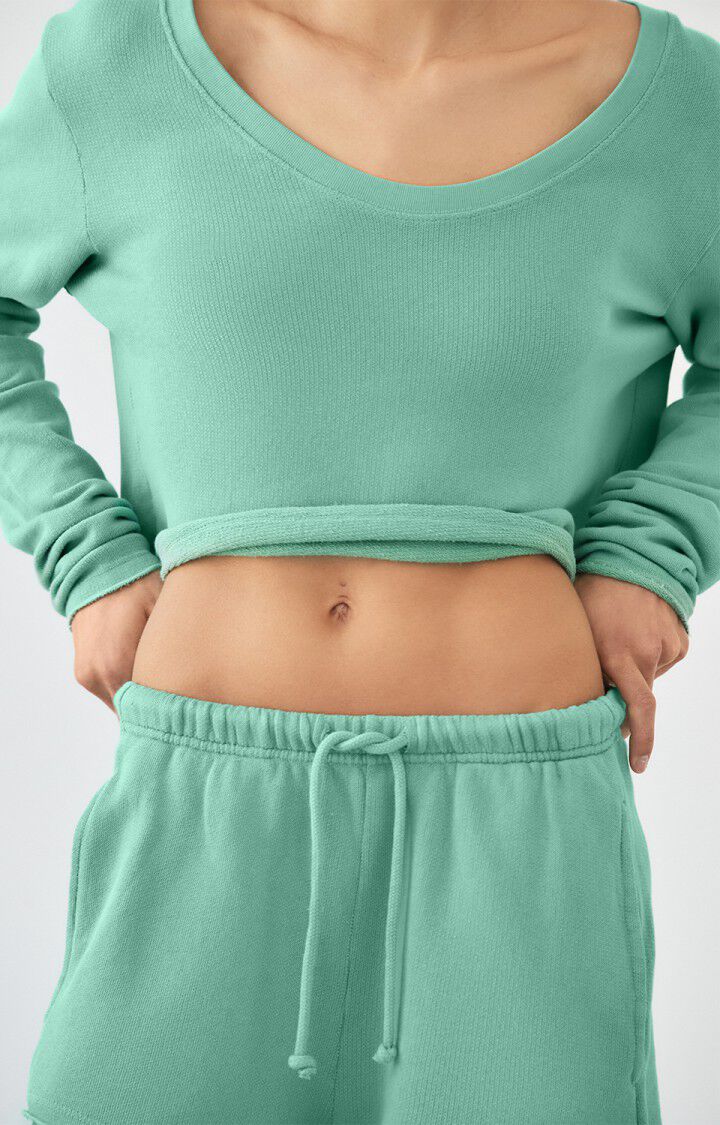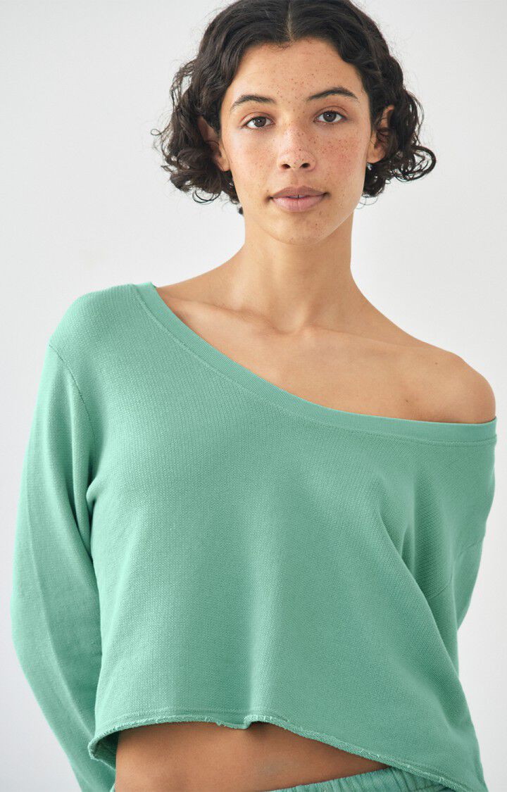 Kort, let og afslappet langærmet sweatbluse fra American Vintage i farven Lettuce. Modellen har en løs pasform med cropped længde og en bred, rund halsudskæring, der giver et casual og let off-shoulder look. Den bløde kvalitet og fine ribstruktur gør den behagelig at have på, perfekt til både hjemmebrug og afslappede hverdagslooks.