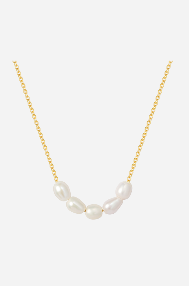 Andcopenhagen Cille halskæde kombinerer uregelmæssige ferskvandsperler med 18 karat guldbelagt rustfrit stål. Den justerbare længde og nikkelfri sammensætning gør det velegnet til sensitiv hud.