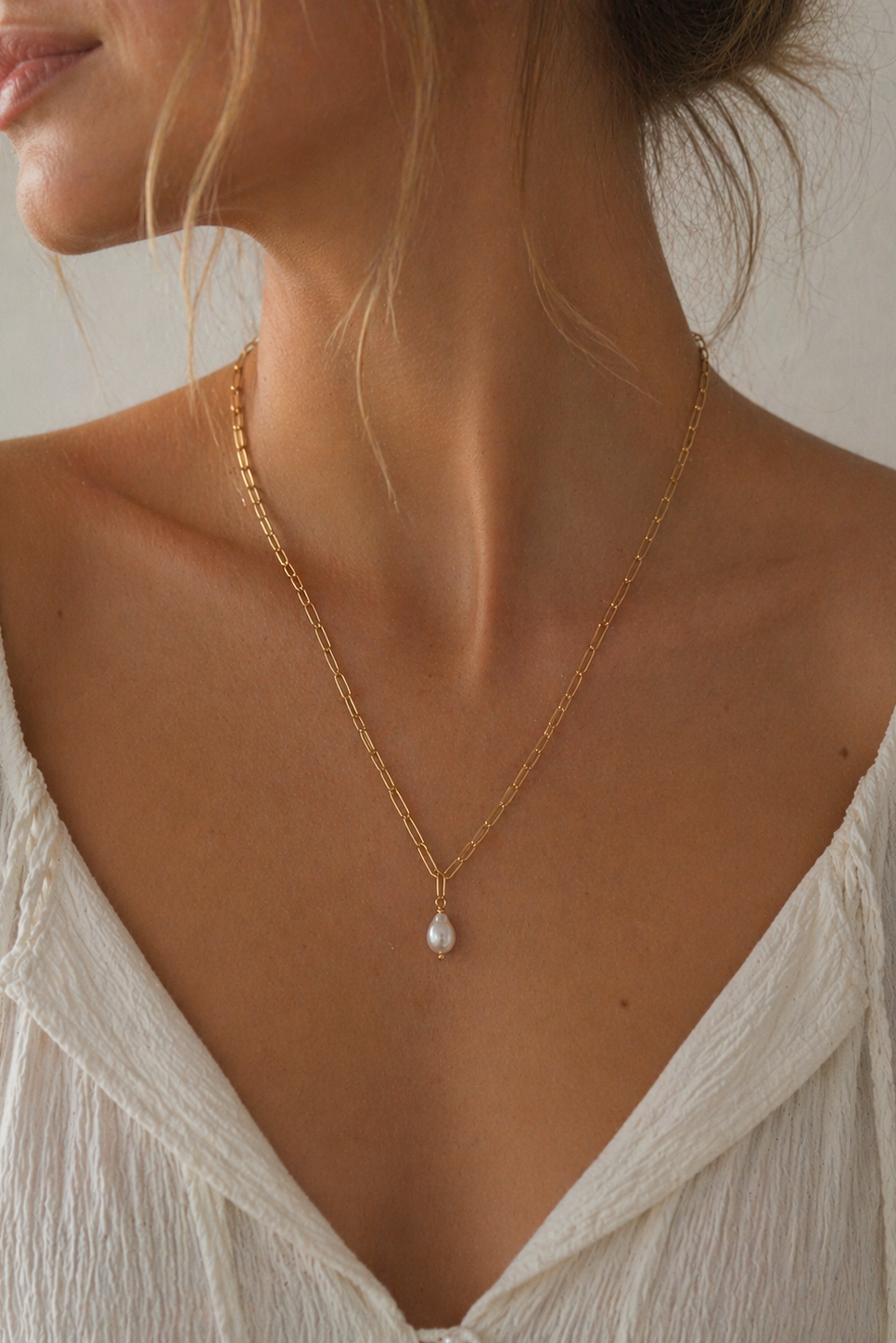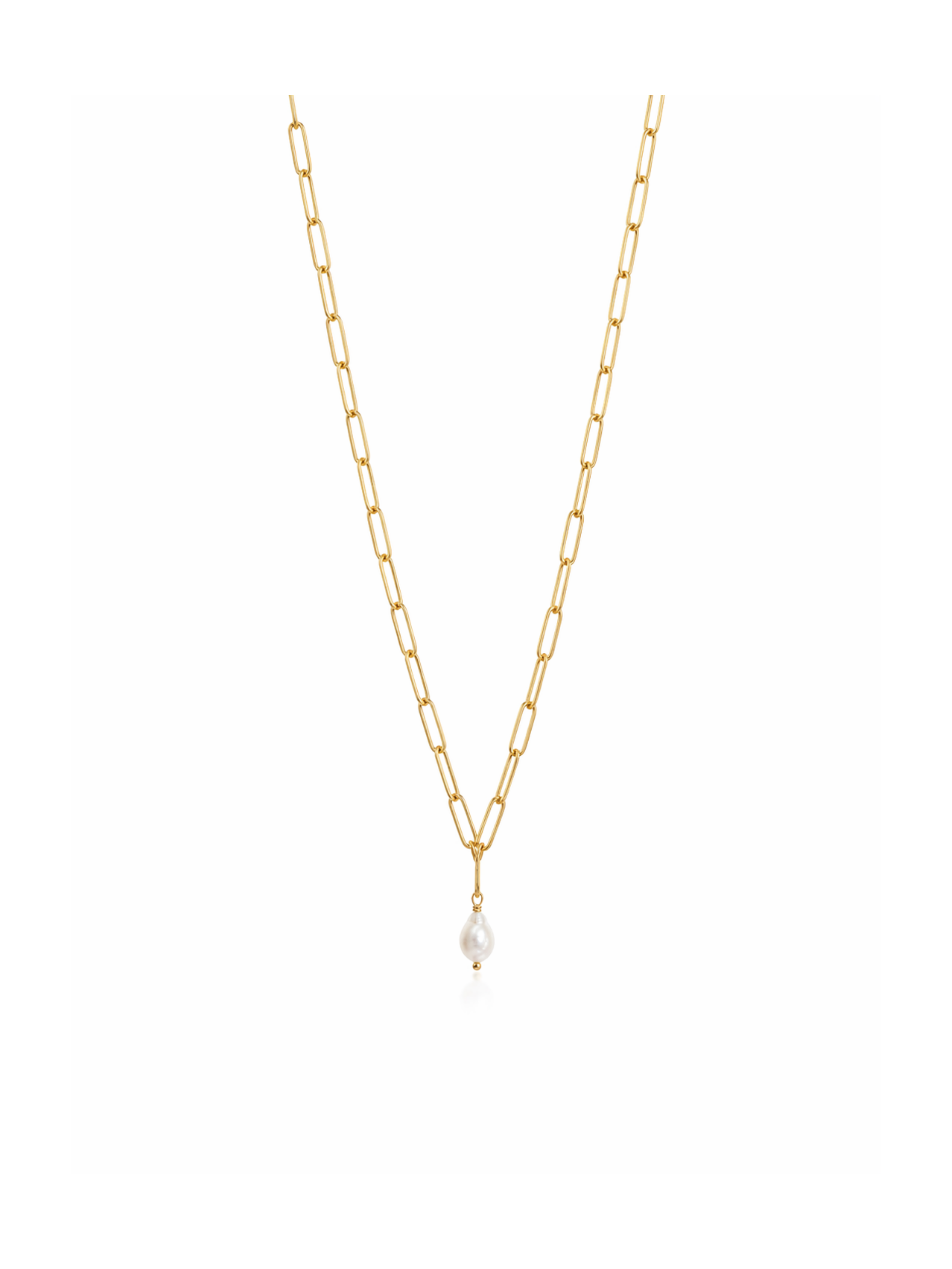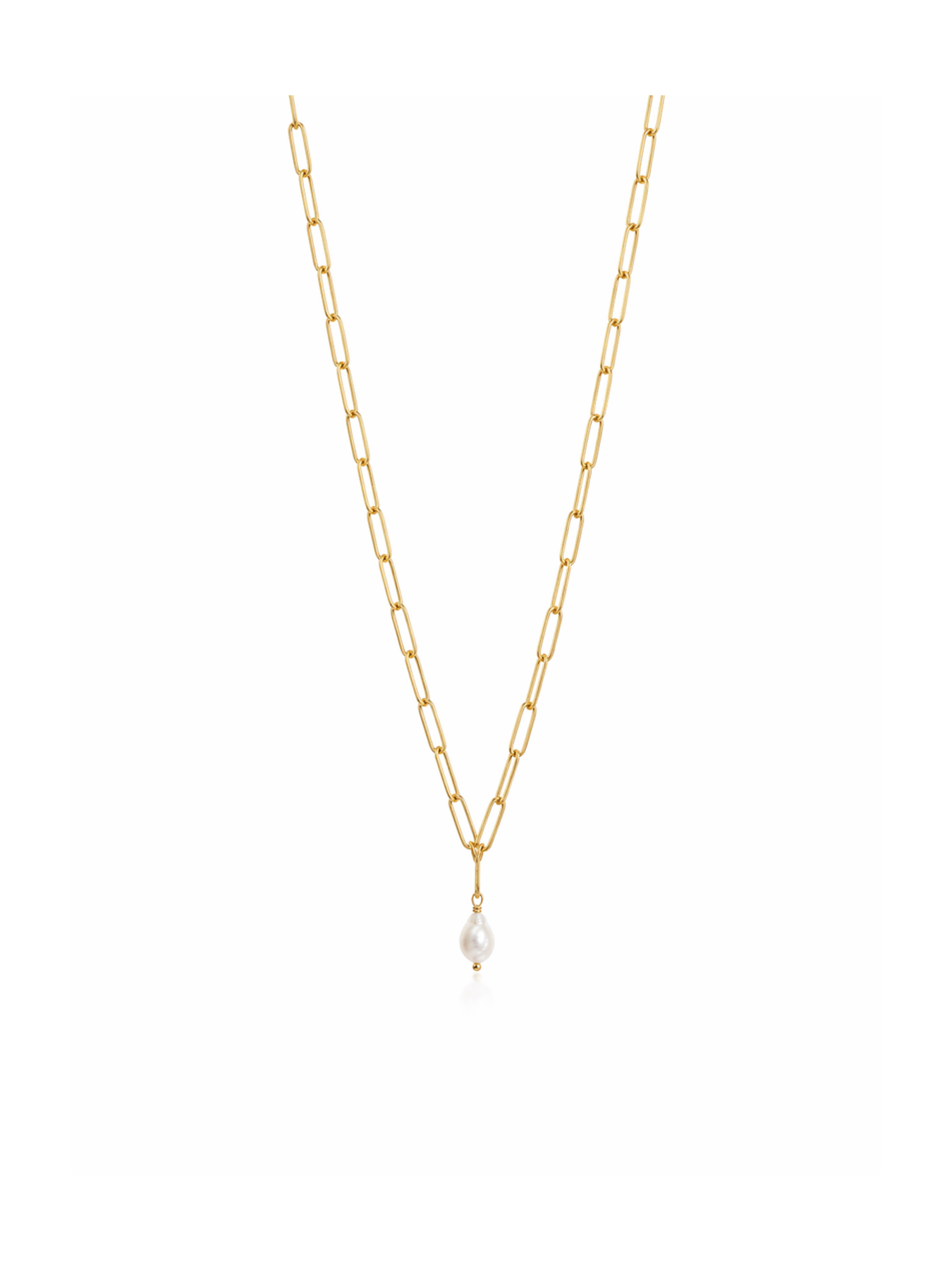 Den guldbelagte overflade giver en varm glød, som fremhæver kædens detaljer og gør smykket nemt at style til både hverdag og fest. Den naturlige baroque perle varierer i form og udtryk, hvilket gør hver halskæde helt sin egen.