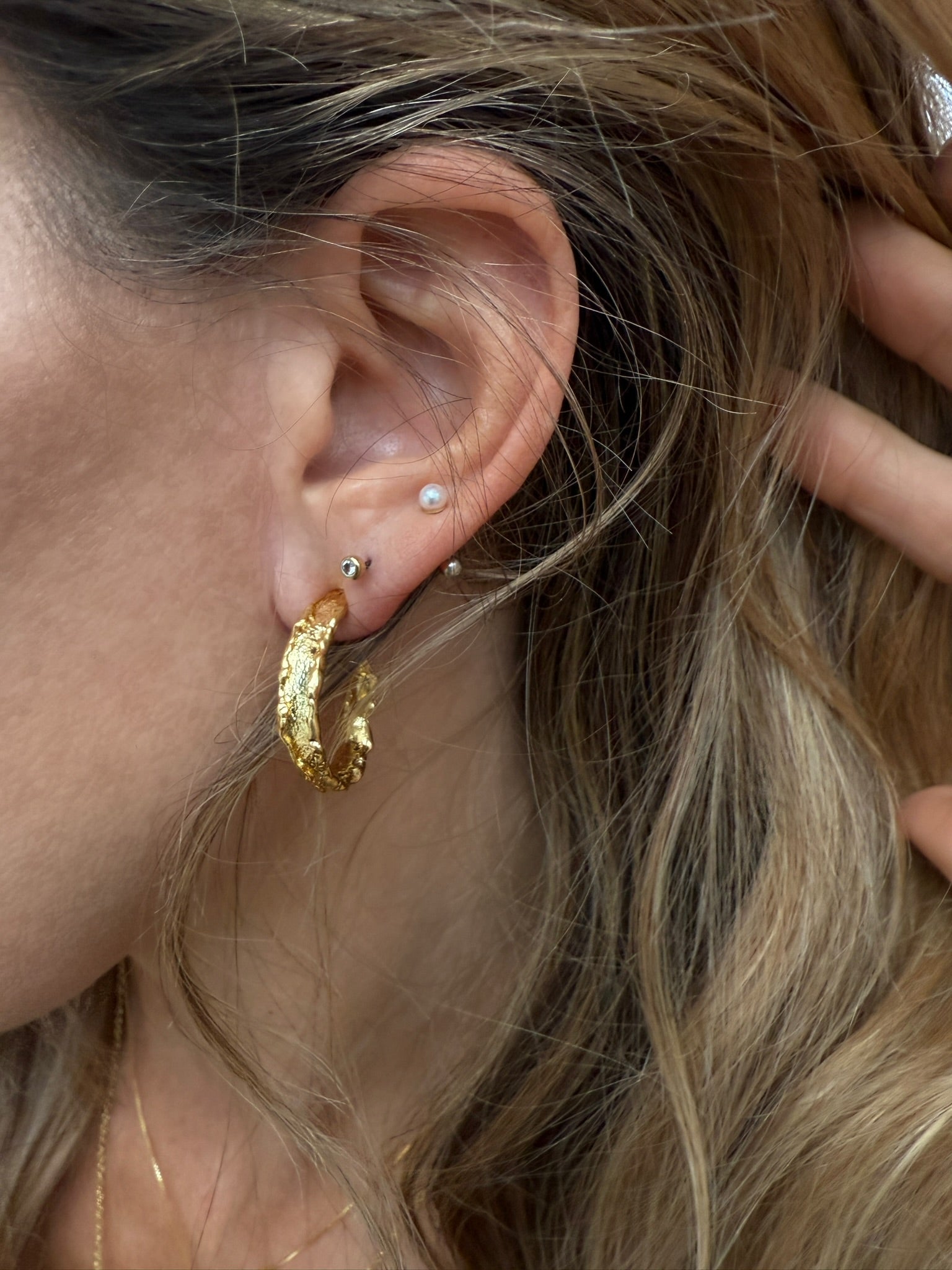 Carmen hoops fra Andcopenhagen har en karakteristisk snoet form med tekstureret overflade, der skaber et dynamisk spil med lyset. Øreringene er store i størrelsen og nemme at style til både hverdag og fest.