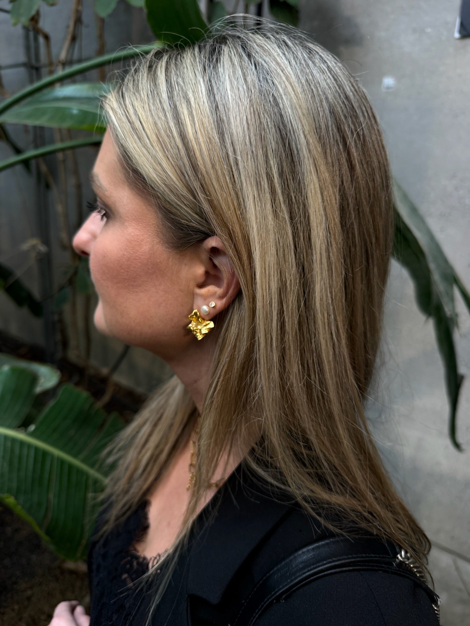 Arlinda-øreringe fra Andcopenhagen har en karakteristisk skulpturel form med en særlig tekstur, der skaber et spil i lyset. Den organiske form gør dem til et udtryksfuldt smykkevalg til festlige anledninger.