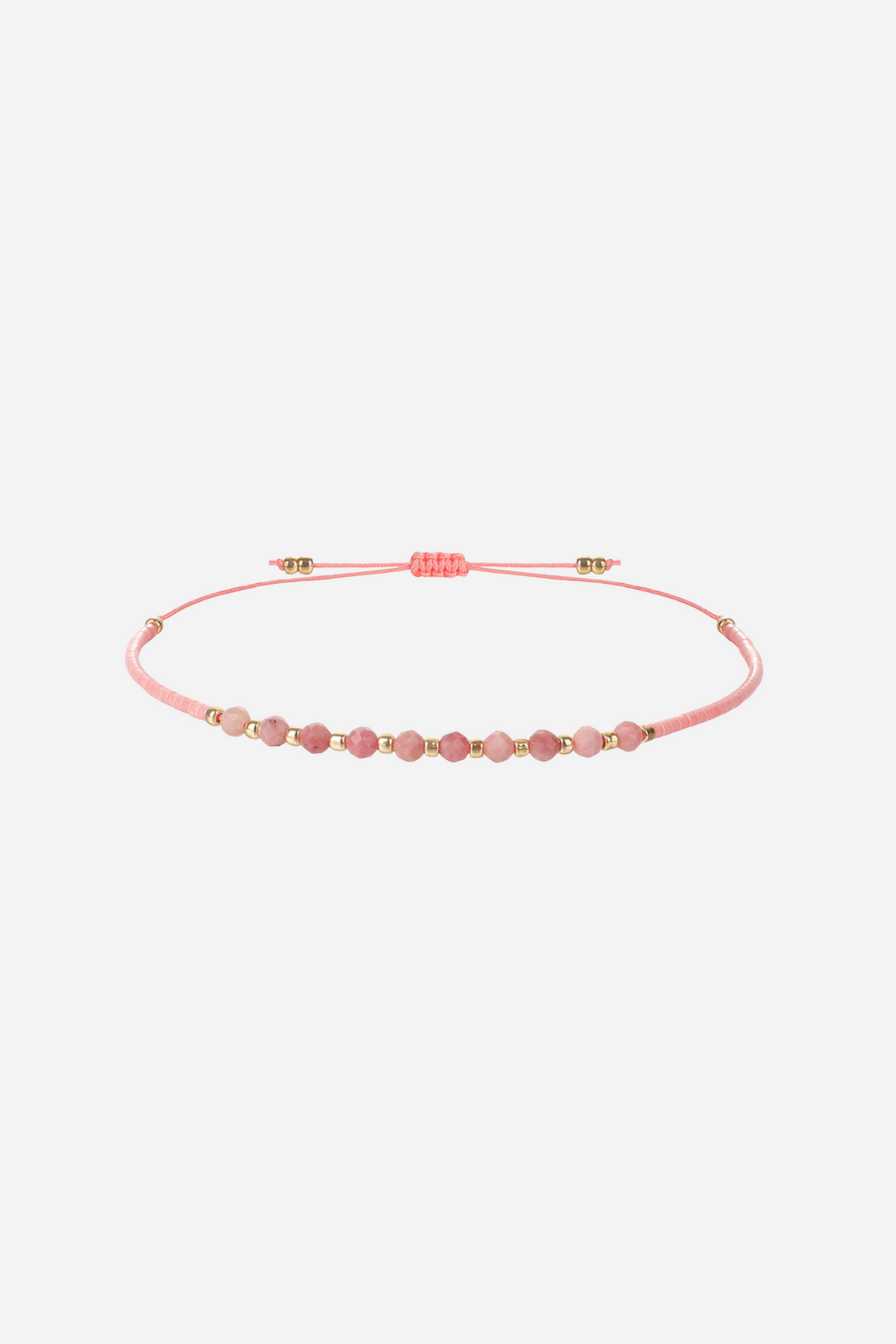 Rosa og lyserøde glasperler med gyldne accenter på en holdbar nylonsnor. Armbåndet har justerbar længde med knude-lukning, så det nemt kan tilpasses dit håndled.