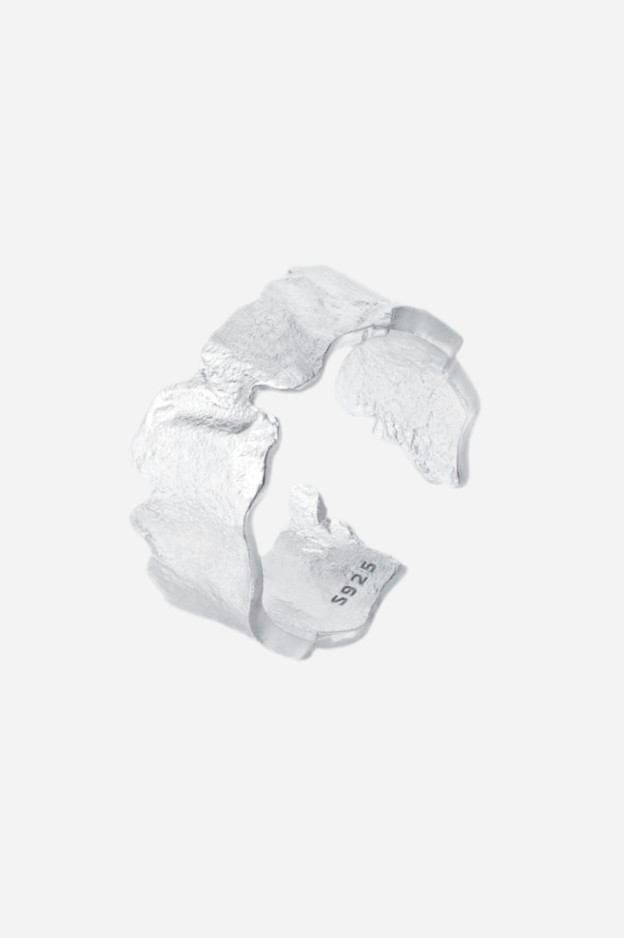 Monica-ringen fra Andcopenhagen har en karakteristisk bølget overflade med tekstureret design. Den justerbare ring skaber et fascinerende spil af lys, der gør den til et naturligt samtaleemne.