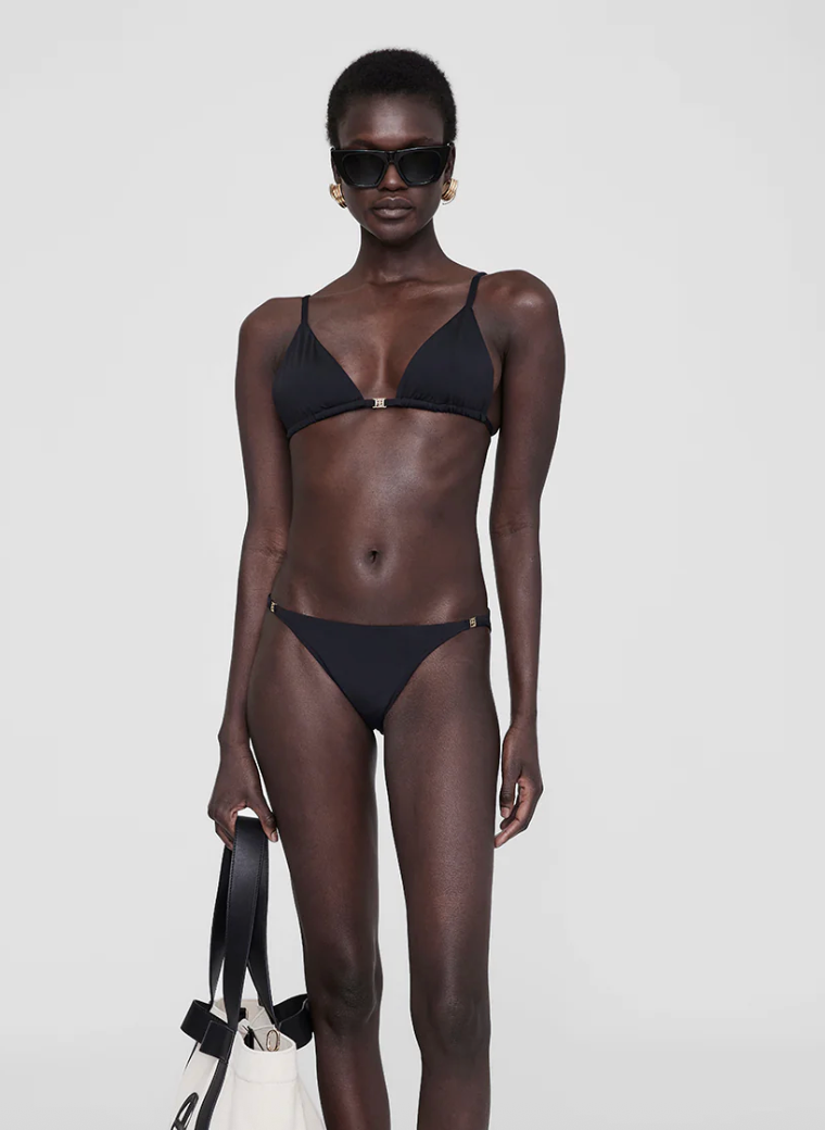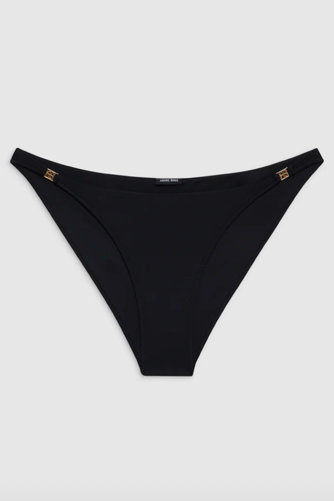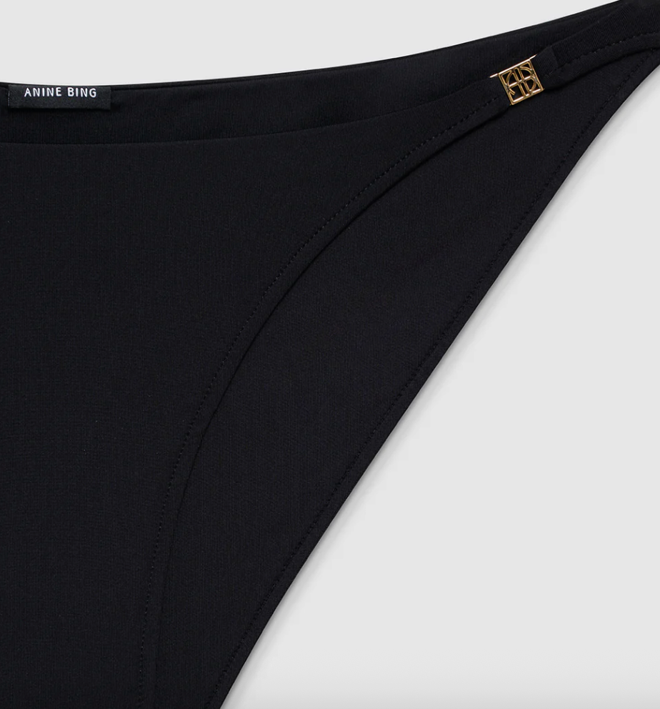 Bellamy Bikini Bottom er lavet af et blødt og strækbart badestof i sort. Denne fuldt forede bikinitrusse har tynde sidestropper og er færdiggjort med et lille håndsyet ANINE BING-monogram som charm.