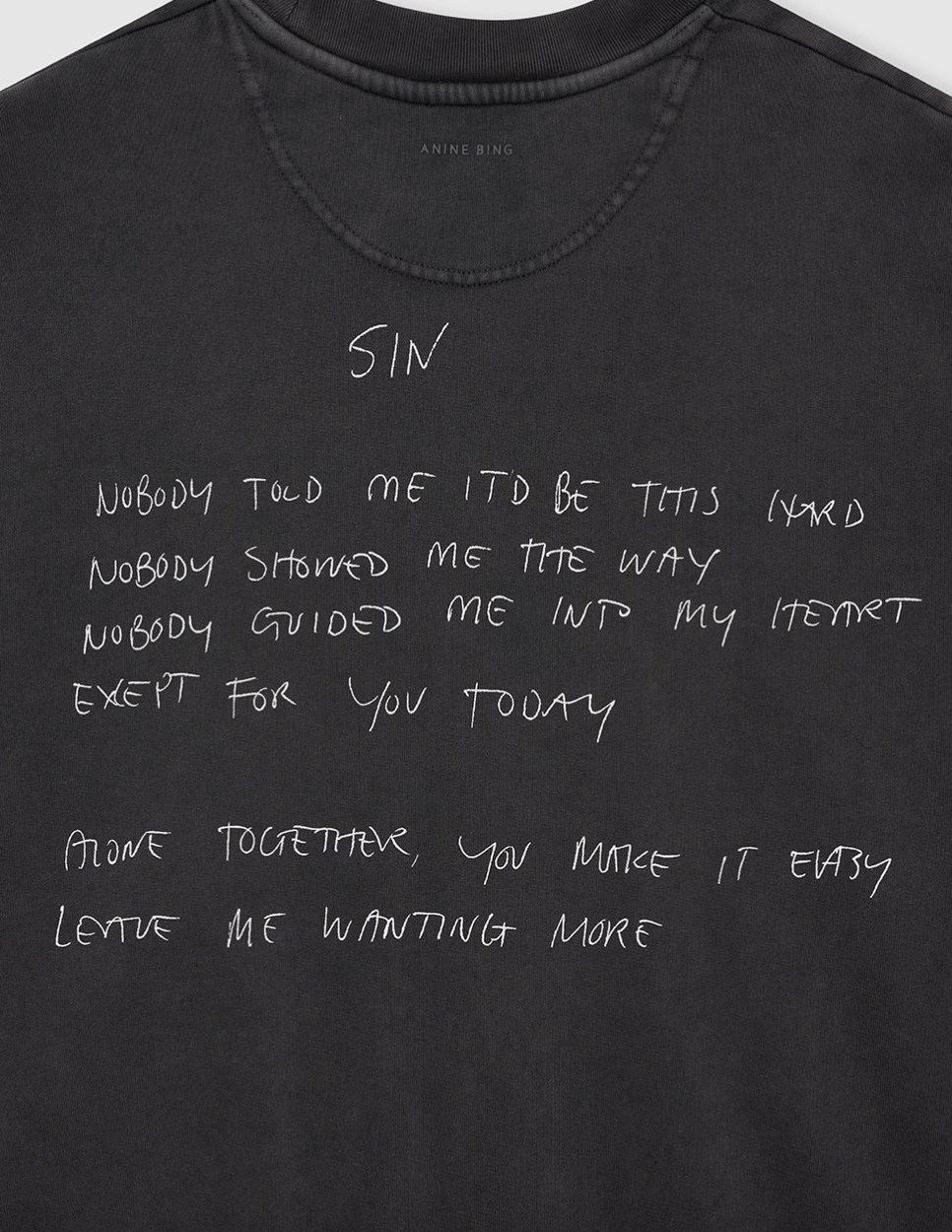 Jaci Sweatshirt Lyrics er en oversized pullover med rund hals, lavet af mellemvægtet 100% bomulds French terry i vasket sort. Denne hyggelige sweater har et håndskrevet grafisk print på venstre bryst og håndskrevne "Sin"-tekster fra Anines album THERAPY på ryggen i kontrastfuld hvid.