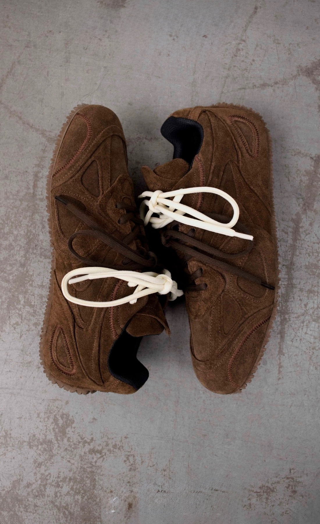 Skoen har en lav profil og er monteret på en flad gummisål med en diskret strikket struktur, der tilfører både komfort og et unikt visuelt udtryk. Farvekombinationen i mørkebrun og mørk gummi skaber et tidløst og alsidigt design, som nemt kan styles til både casual og mere velklædte outfits.