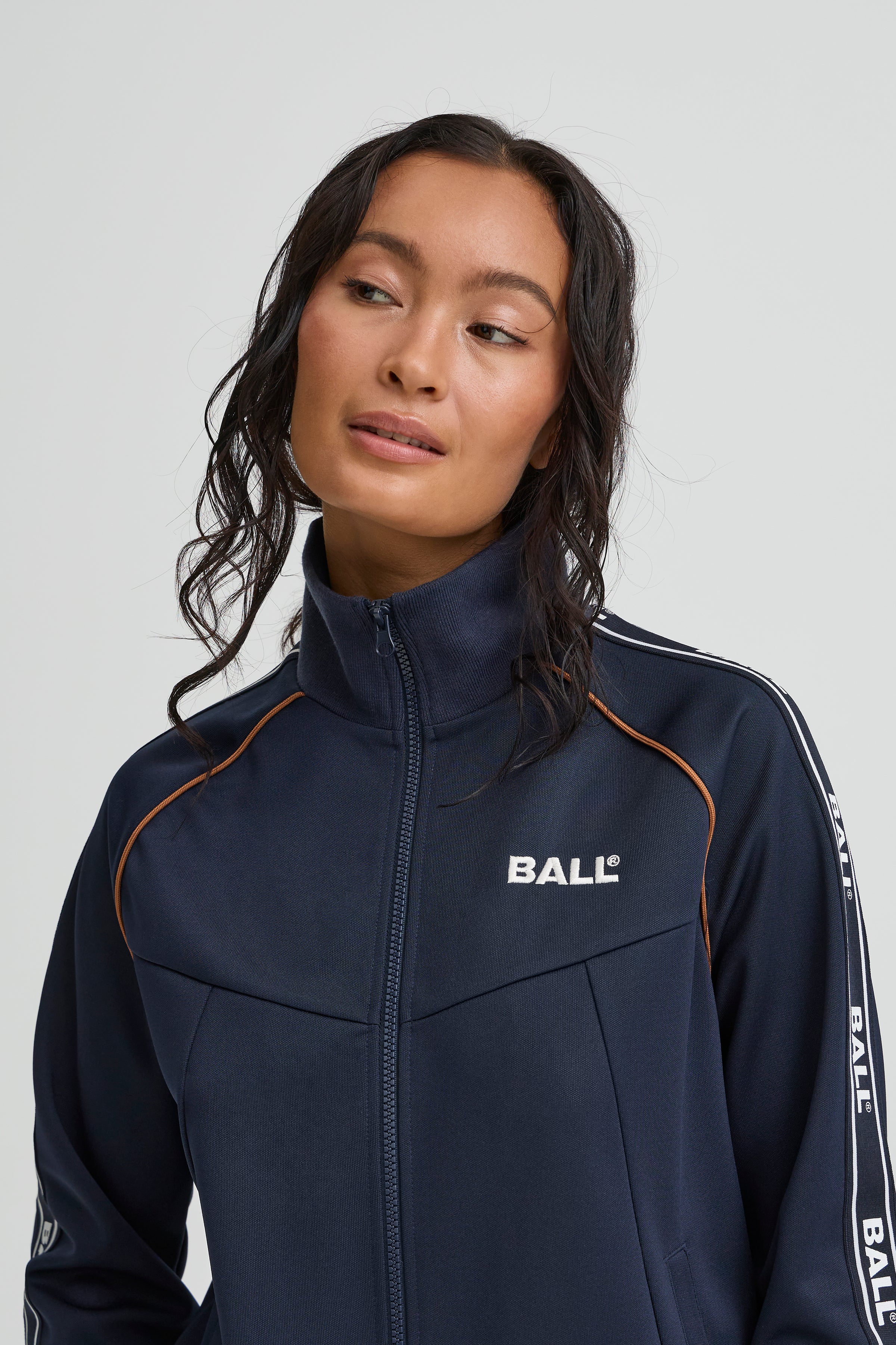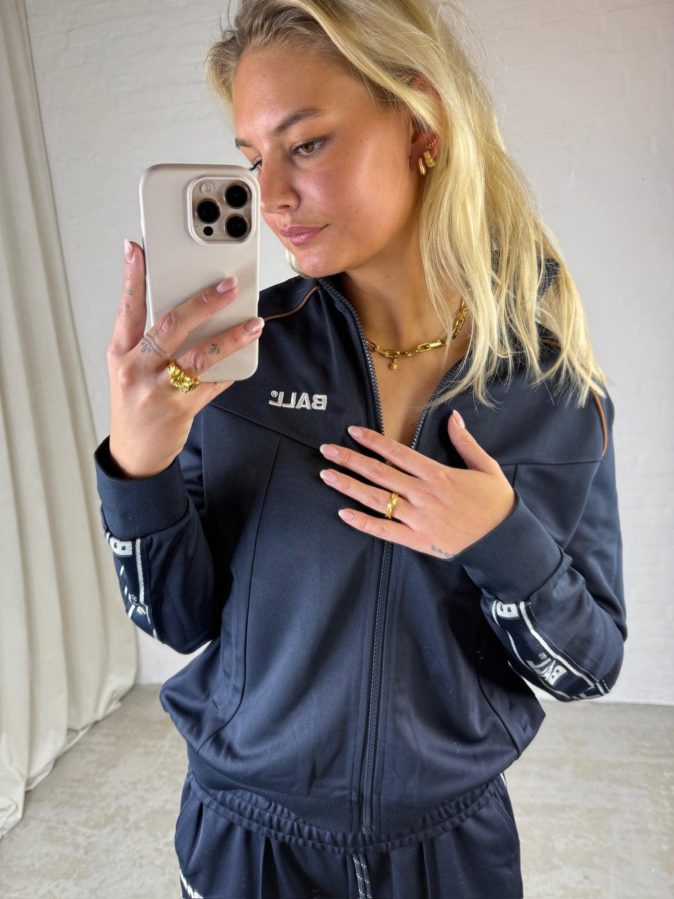 Den blå Ball Nicolina Track Jakke bringer et sporty, retro-inspireret look ind i hverdagsgarderoben. Jakken har en praktisk lynlås, høj krave og sidelommer, mens de kontrastfarvede striber på ærmerne og det diskrete brystlogo giver et klassisk track-præg. Lavet i let polyester med en normal pasform, er den ideel til både jeans, træningsbukser eller casual outfits.