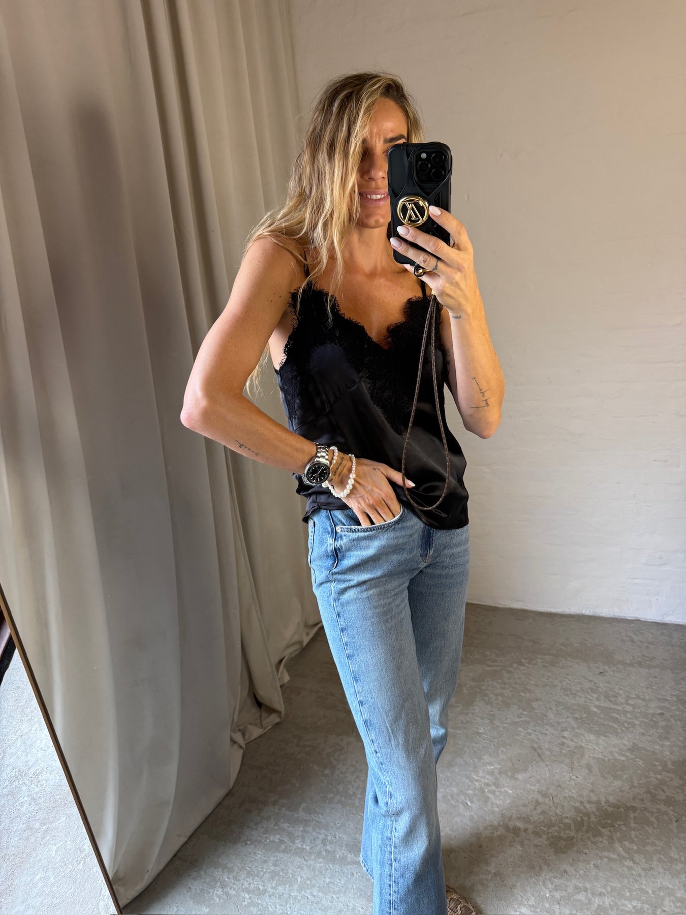 Elegant sort top med blonde detaljer på fra CC Heart. Toppen har en v-udskæring hvor der er blonder rundt i kanten, derudover har toppen tynde justerbare stropper.