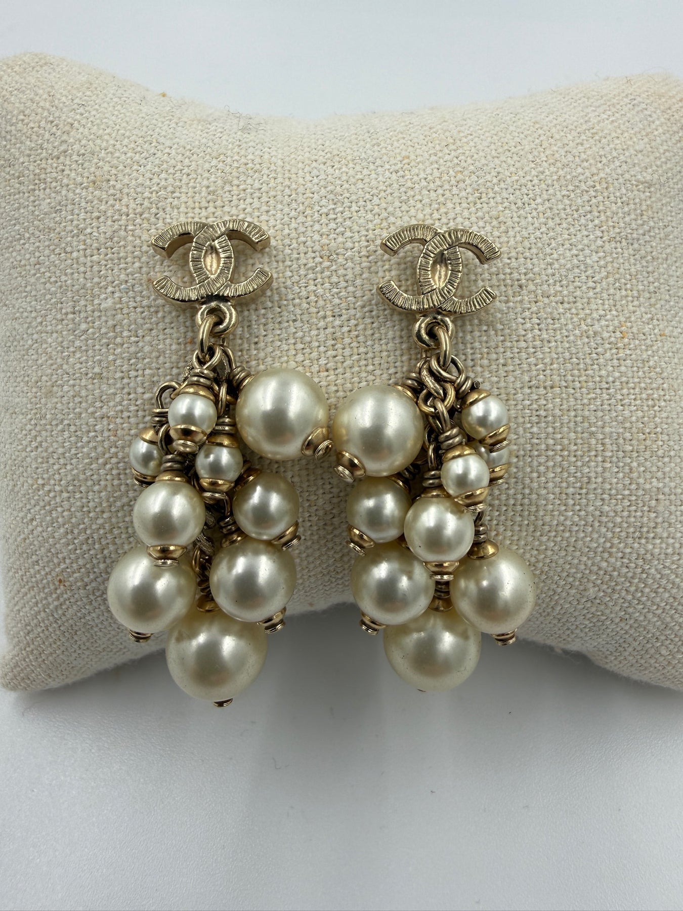 Elegante Chanel øreringe i klassisk, tidløst design. Øreringene er udført med det ikoniske CC-logo i guldfarvet metal, hvorfra der hænger et dekorativt bundt af imiterede perler i forskellige størrelser. Perlerne er monteret på fine kædeled og bevæger sig smukt, hvilket giver øreringene et levende og luksuriøst udtryk.