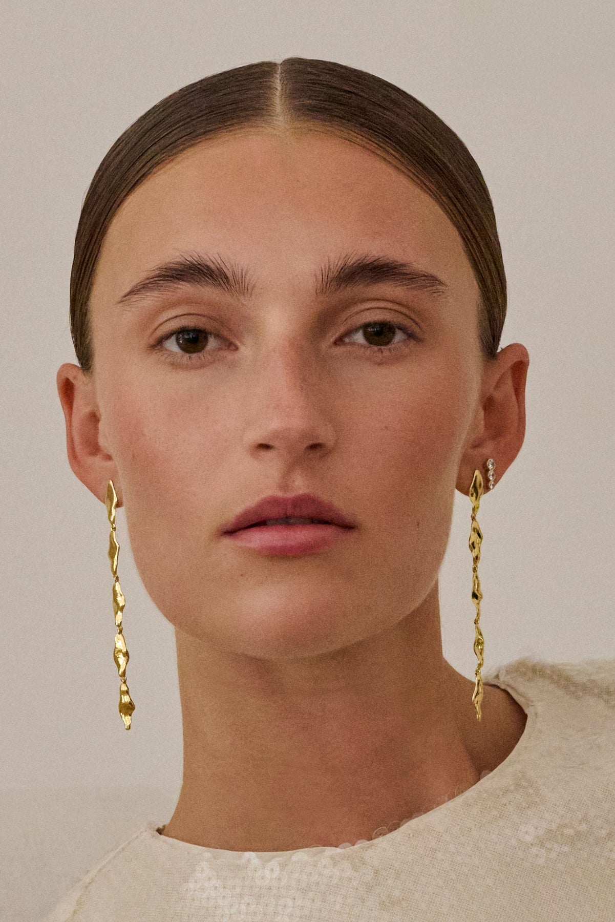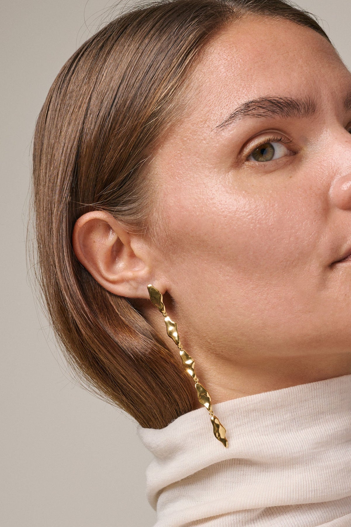 Med deres længde på 95,5 mm og en bredde på 7 mm fremhæver de ansigtets form og tilfører et luksuriøst touch til ethvert outfit. Disse øreringe er fremstillet af genanvendt sterlingsølv og belagt med 18 karat guld, hvilket gør dem til et ansvarligt og tidløst valg.