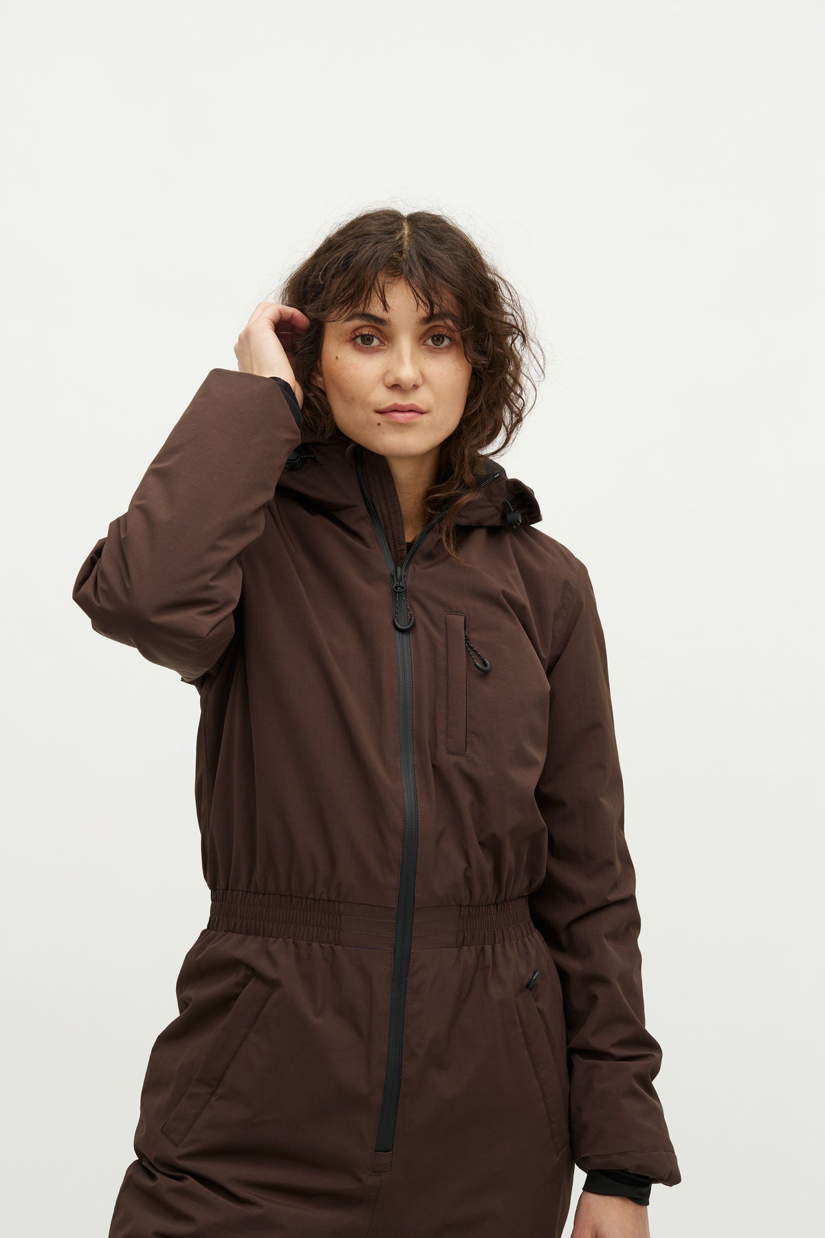 Dragten har lange ærmer med vindstop og tapede syninger, der effektivt beskytter mod vind og vand. Lynlåsen i front gør den nem at tage af og på, og elastikken i taljen giver en flatterende og behagelig pasform. Den forede fleece og hætten med justerbar snøre sørger for ekstra varme og komfort.