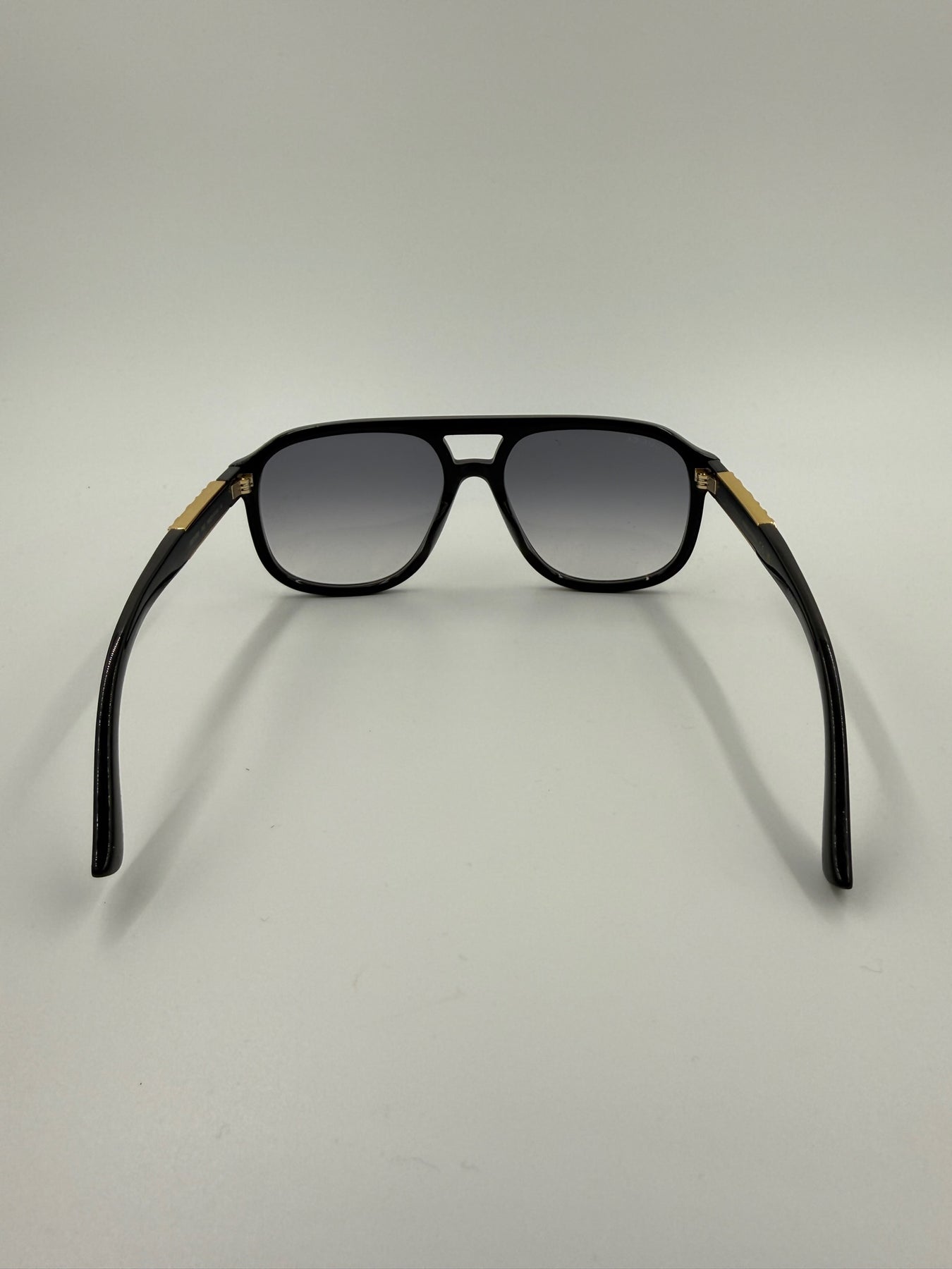 Modellen har en firkantet, pilot-inspireret front med en karakteristisk udskæring ved næsebroen, som giver brillen kant og personlighed. Glassene er tonede i en elegant grå gradient, der både beskytter mod solen og fuldender det eksklusive look.