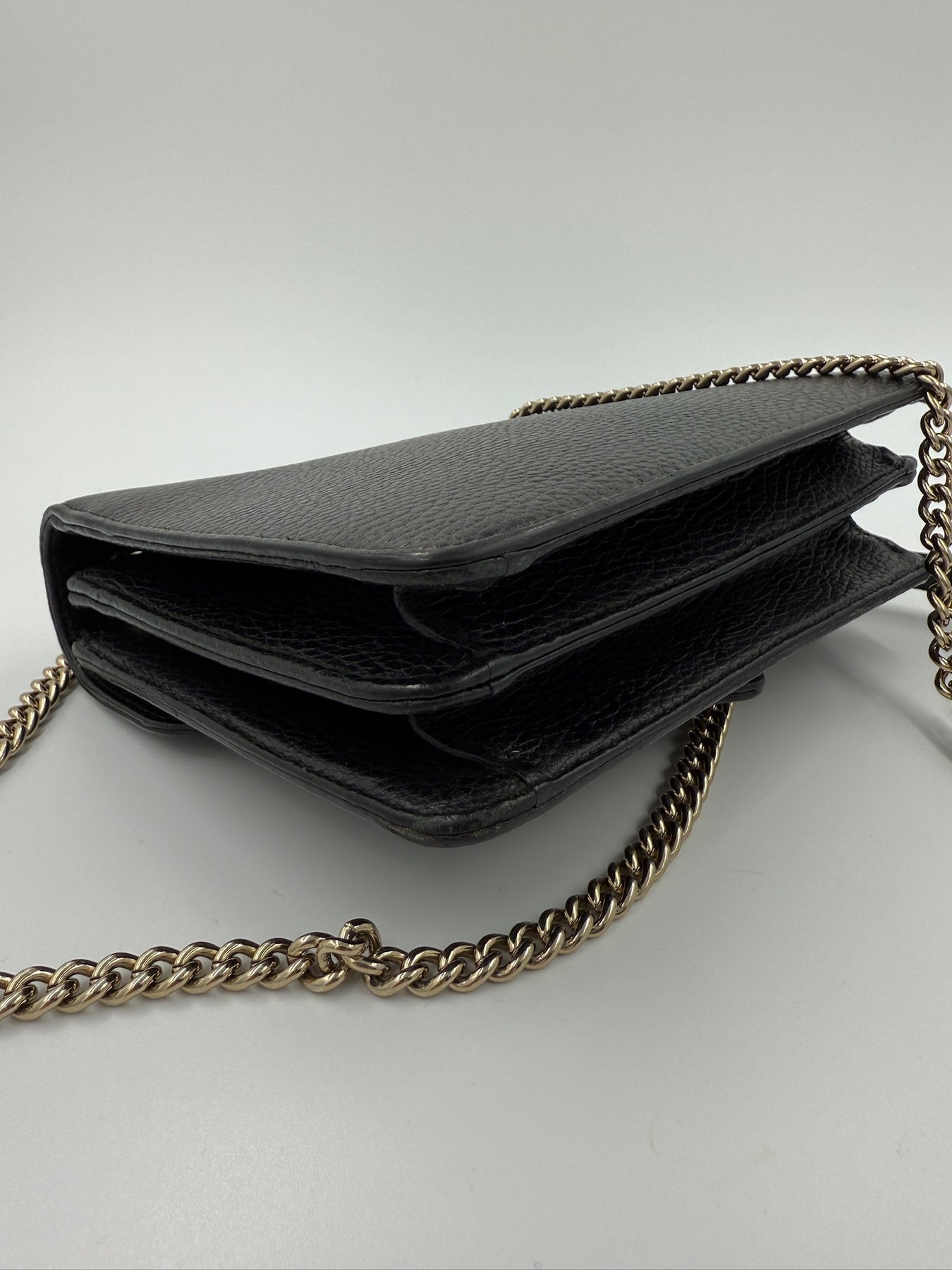 Denne Gucci Interlocking Shoulder Bag er udført i sort, struktureret læder med det ikoniske guldfarvede Interlocking G-logo på fronten. Tasken har en elegant flaplukning og en justerbar kæderem med læderindsats, som gør den komfortabel at bære over skulderen eller crossbody. Indvendigt er den foret med lyst tekstil og opdelt i flere rum, der giver god organisering. Et tidløst og sofistikeret design, der passer perfekt til både hverdag og særlige anledninger.