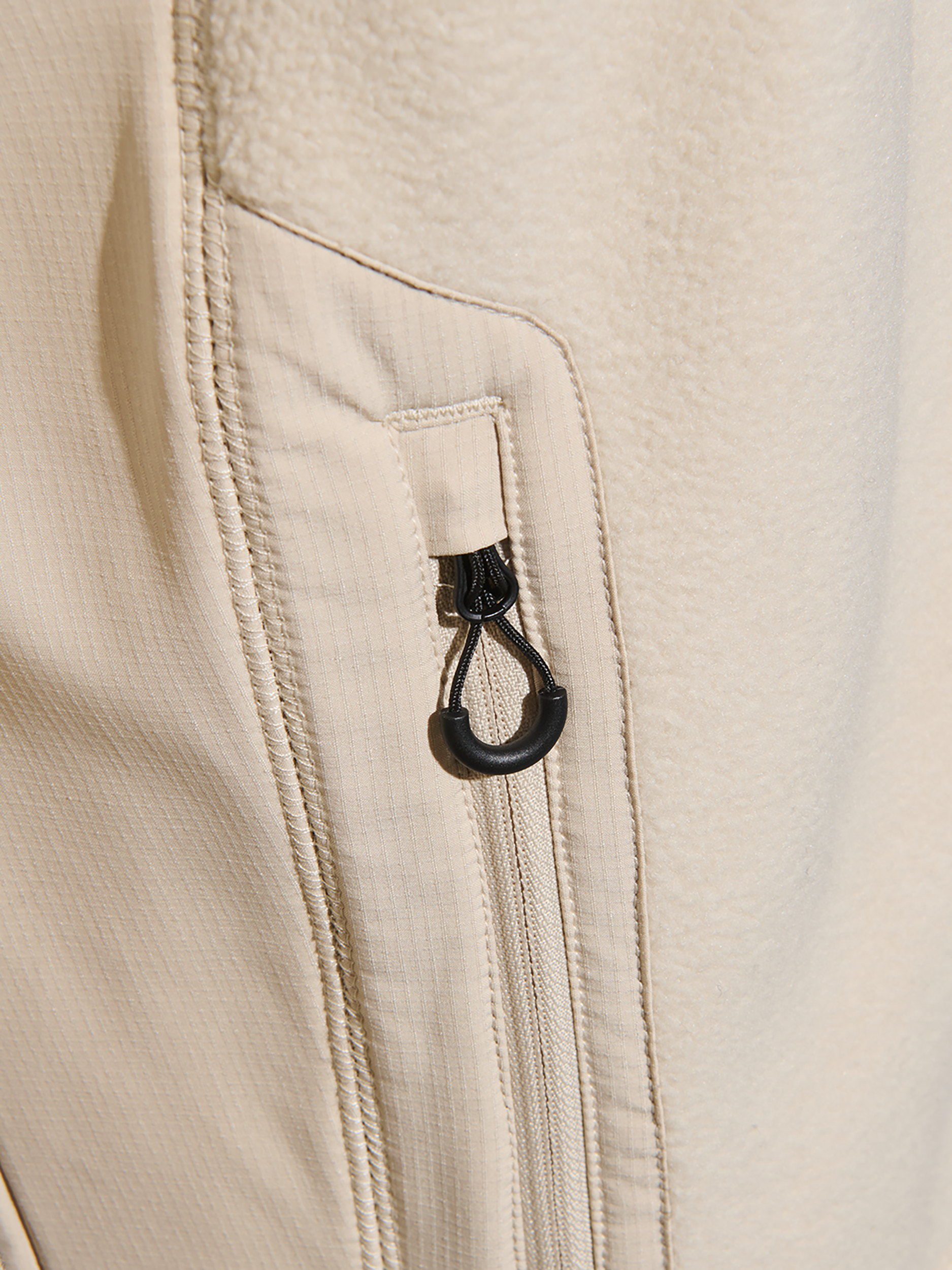 Jakken er udstyret med lynlås fortil og en høj hals med hagebeskyttelse, som holder vinden ude og giver en behagelig pasform omkring nakken. Forneden og ved ærmekanterne er der anvendt flatlocksømme, der giver et rent og fleksibelt finish. Indvendigt er jakken foret for øget komfort, og den justerbare kant gør det nemt at tilpasse pasformen efter behov.