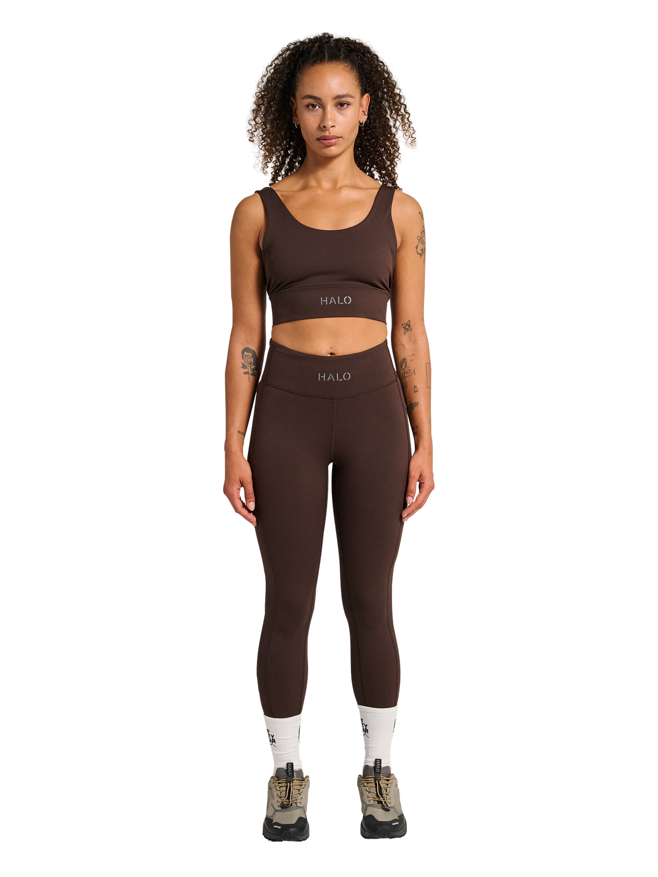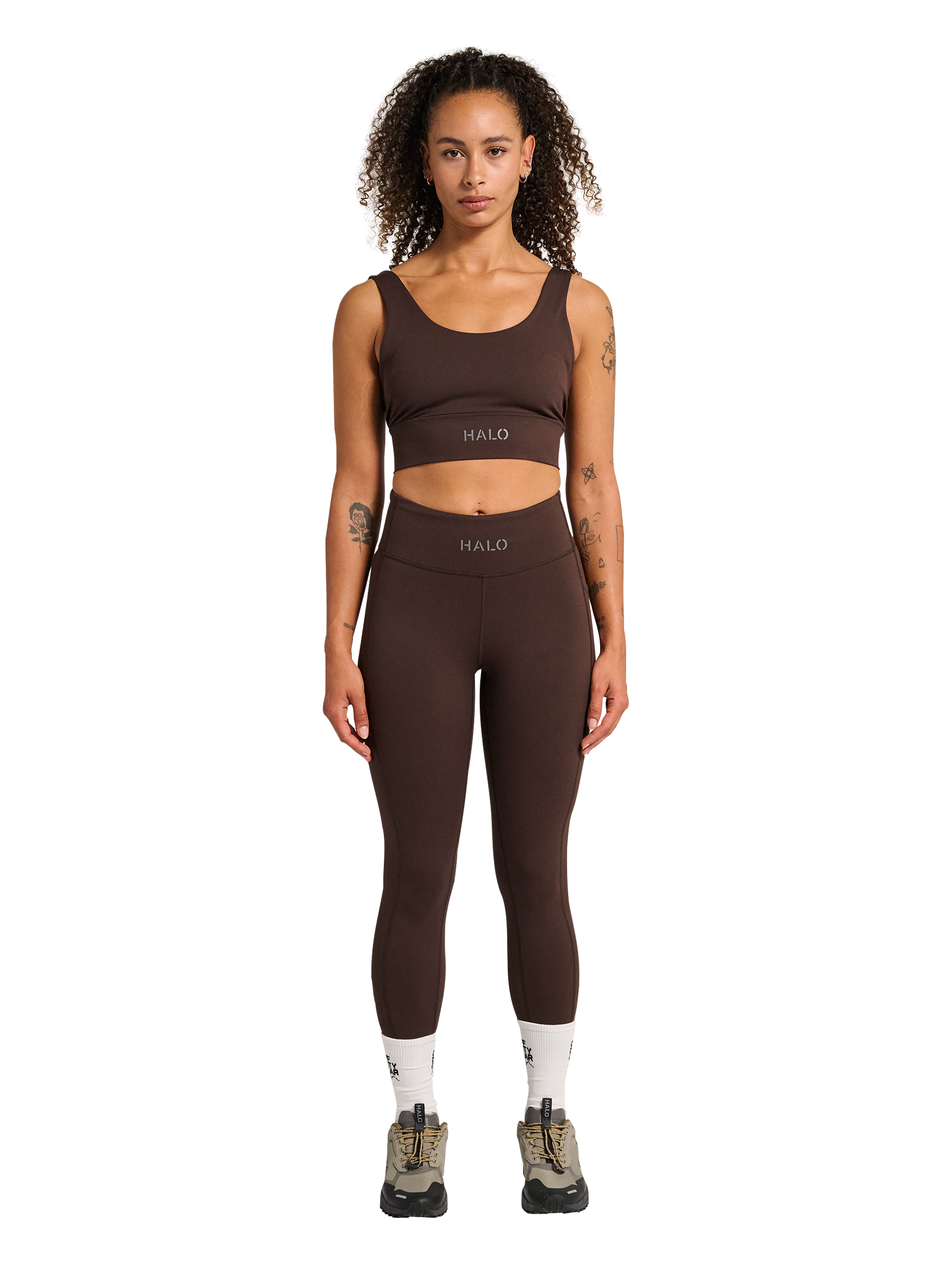Disse HALO leggings i chokoladefarve giver dig støtte under træning med deres høje talje. Det strækbare jerseystof med åndbar mesh holder dig tør, mens reflekserne øger din synlighed i mørket.